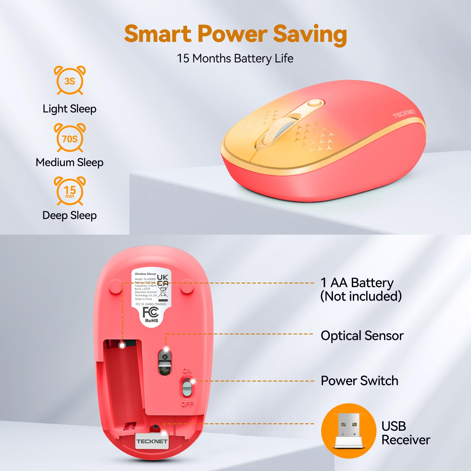 【Easy to Use Laptop Mouse】 TECKNET travel mouse comes with a nano receiver (stored IN the mouse). 2.4GHz wireless technology ensures reliable connectivity up to 49ft. 3 adjustable DPI levels (1600/1200/800) to meet your different needs. Only need 1xAA battery (NOT included) to support up to 15 months battery life.