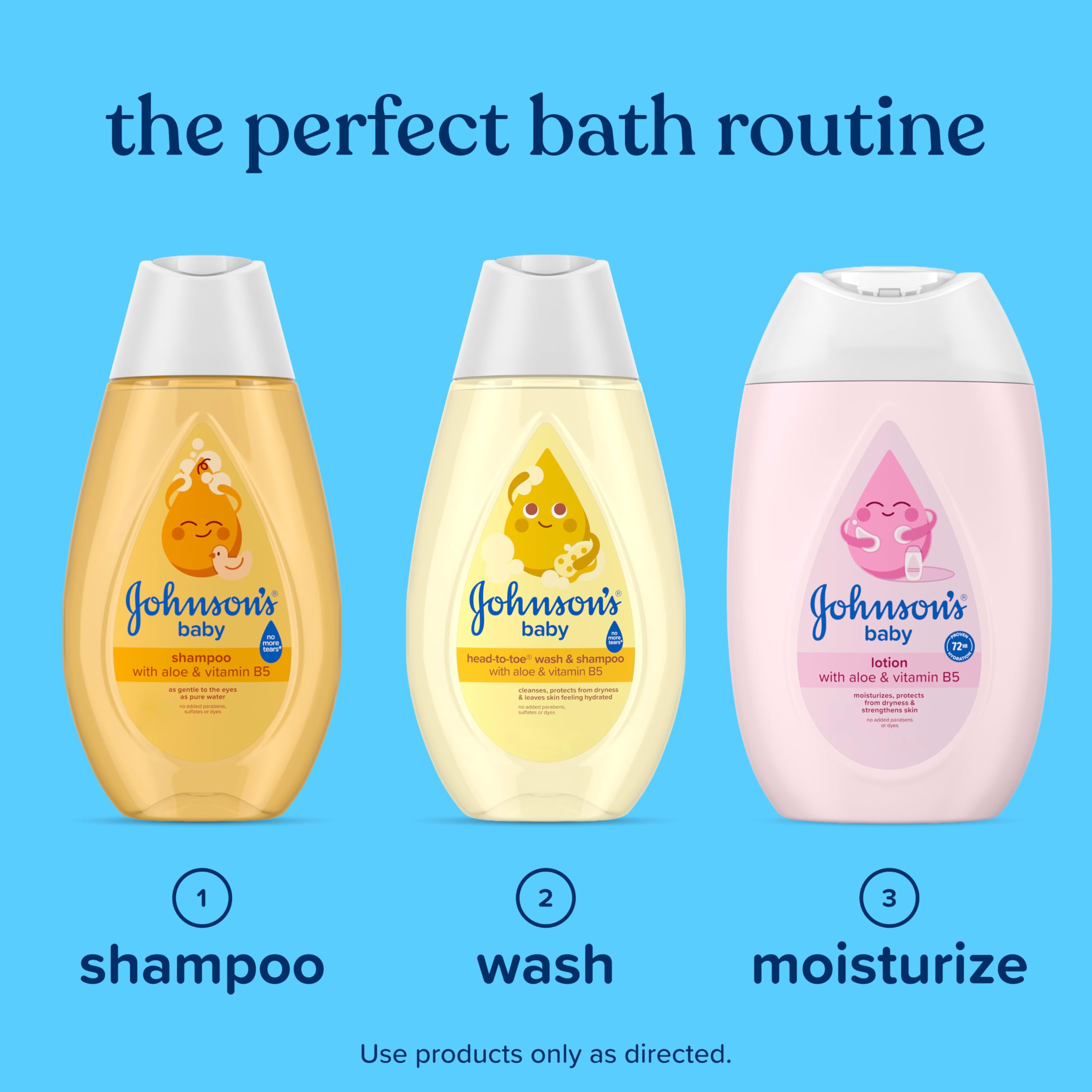 Moisturize your little one’s skin with Johnson’s Baby Lotion with coconut oil, aloe vera, and vita-min B5. Gentle enough for babies and the whole family, this newborn lotion is proven to hy-drate skin for 72 hours. Specially formulated for newborn and delicate skin, it moisturizes, pro-tects from dryness, and strengthens skin. Pediatrician & Dermatologist tested, this pH-balanced lotion has a unique gentle baby scent and is hypoallergenic with no added parabens or dyes. Our formula can help fight the 5 signs of itchy dry skin such as – itchiness, tightness, flaking, scaling, and redness. Johnson’s Baby cares for what is precious: your baby’s precious skin and hair, and precious moments of bonding. Packaged in a bottle made with 50% recycled plastic. Part of the perfect 3-step bath routine: 1. Shampoo with Johnson's Baby Shampoo 2. Wash with Johnson’s Head-To-Toe Wash & Shampoo 3. Moisturize with Johnson’s Baby Lotion Our Formula: Now with Aloe Vera & Vitamin B5: Our formula, with aloe vera, vitamin B5 and coconut oil, hydrates delicate skin, leaves skin feeling soft, and supports a healthy skin moisture barrier. Hypoallergenic, pH-balanced, and formulated with no added parabens or dyes. Tested by Pediatricians; made with unique gentle baby scents How to Use: After a warm bath with Johnson’s Baby Shampoo and Johnson’s Baby Head-to-Toe Wash, gently massage Johnson's Baby Lotion over baby’s entire body for 72-hour hydration. Can also be used anytime to moisturize skin. Brand Story: Johnson’s Baby cares for what is precious: your baby’s precious skin and hair, and precious mo-ments of bonding. For over 125 years, we’ve been committed to crafting gentle, science-backed baby care products that support happy, healthy bonding moments. World's #1 Baby & Child Care Brand* *Source Euromonitor International Limited; Beauty and Personal Care 2025 ed. As per Baby and Child-Specific Products Category; all retail channels; value sales at RSP; 2024 data.