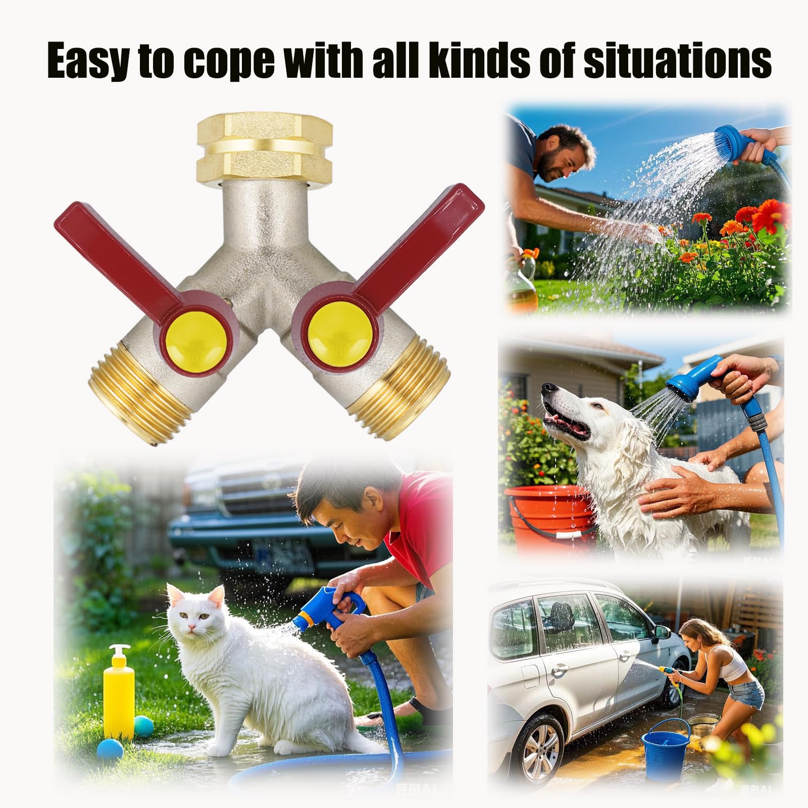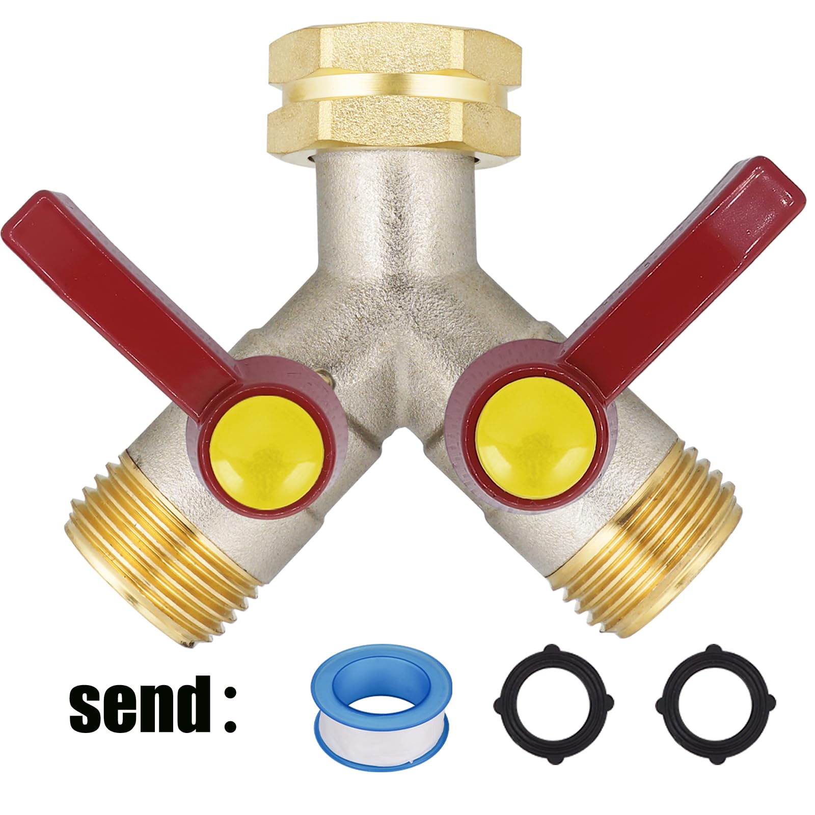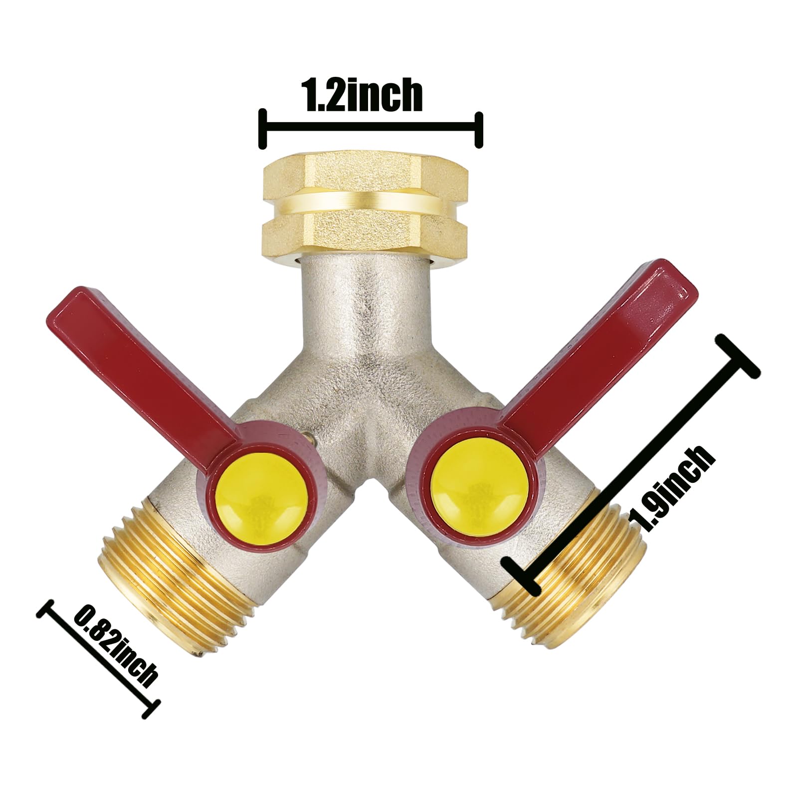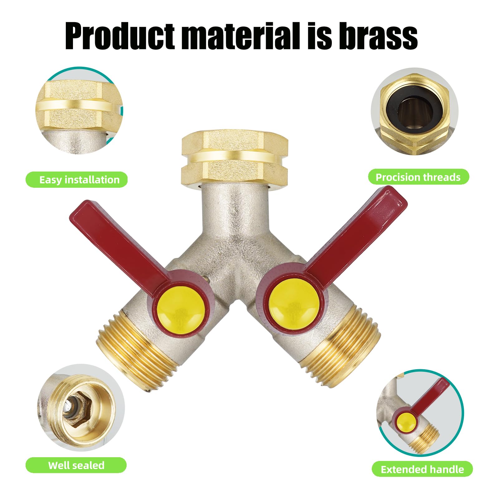 EASY INSTALLATION: The 2 way hose splitter and faucet splice is made of pure brass hex nuts, making your installation of the garden hose y splitter 2 way easier. water hose splitter 2 way heavy duty improved the handle length to 1.9 inches, allowing you to use y hose splitter 2 way with less effort.