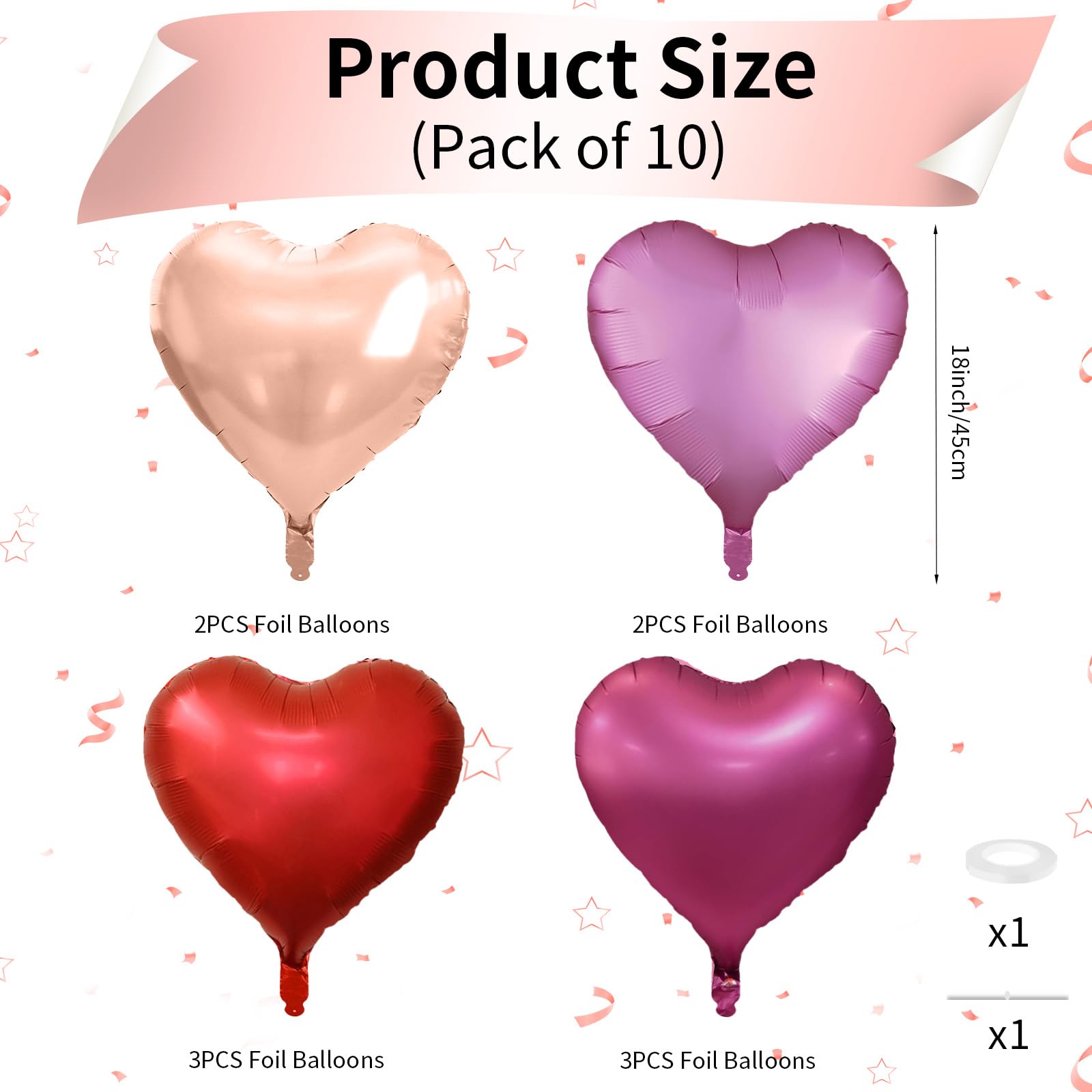 10 PCS Rose Gold Pink Heart Balloons: Our package contains 3 x 18 inches hot pink heart shaped balloons, 3 x 18 inches red heart shaped balloons, 2 x 18 inches rose gold heart shaped balloons, 2 x 18 inches pink heart shaped balloons, 1 x 10m ribbon. The red pink foil heart balloons are specially designed to add a touch of fun and surprise to any party or holiday celebration.
