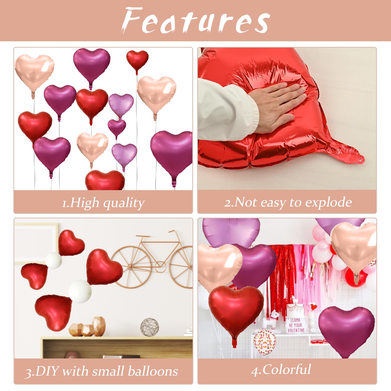 Premium Look Foil Heart Balloons: All materials of heart foil balloons are of high quality and good safety foil, harmless, not easy to break and last a long time, glossy, beautiful in shape. The glossy surface reflects light beautifully, making them stand out as statement pieces for your wedding balloons, valentines balloons, or birthday balloons setup.