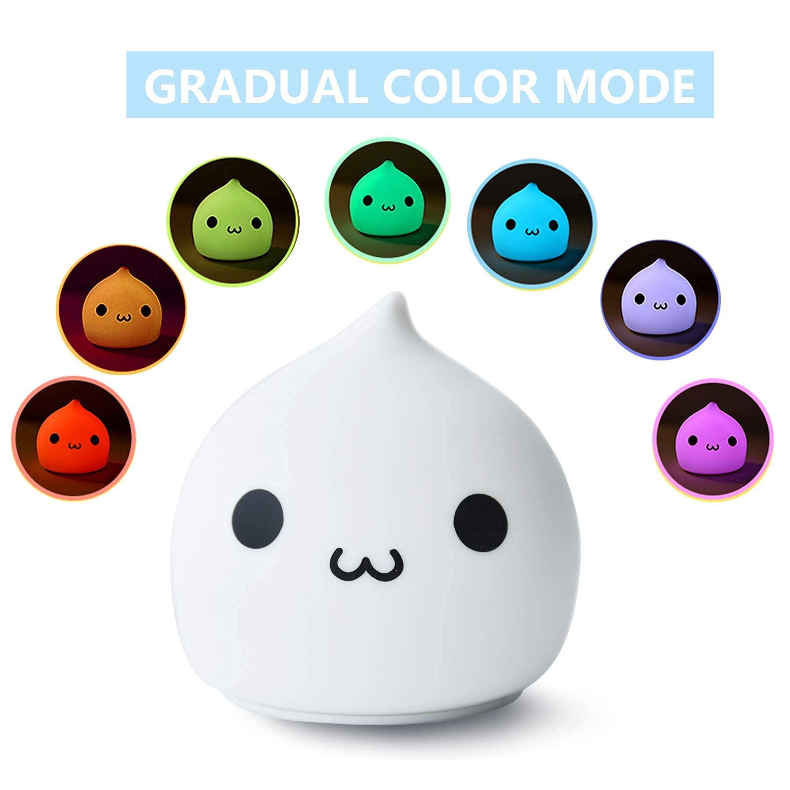 【Color night light】Switch between warm white mode and 7 breathable color modes, simply lightly press the soft silicone surface of the light to switch modes.