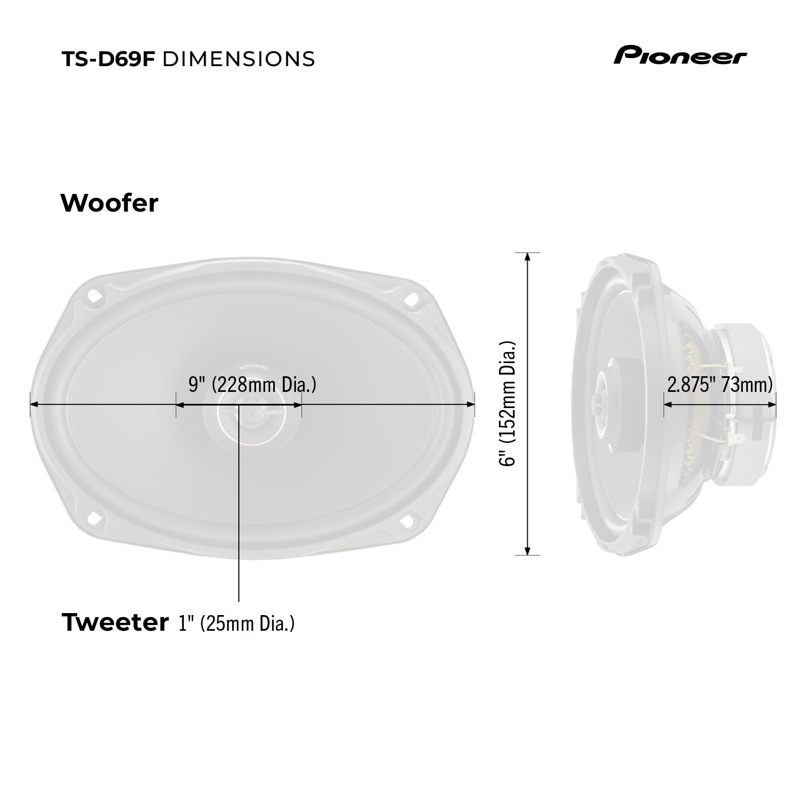 Upgrade your car's audio system with the Pioneer TS-D69F 6 x 9” 2-Way Car Speakers. These speakers are designed to deliver enhanced sound quality and performance, allowing you to enjoy your favorite music like never before. These speakers are a popular choice for many car models. They fit seamlessly into standard speaker openings, making installation hassle-free. Whether you're replacing existing speakers or upgrading from factory-installed ones, the TS-D69F is designed to deliver superior audio reproduction. With a maximum power handling of 330 watts and a continuous power handling of 100 watts, the TS-D69F can handle higher power levels, allowing you to enjoy louder and more dynamic audio. The speakers are designed to deliver impressive volume levels without sacrificing clarity or causing distortion. Upgrade your car's audio system with the Pioneer TS-D69F 2-Way Car Speakers. Experience improved sound quality, enhanced bass, and clear vocals, bringing your music to life on the road. Enjoy the Pioneer quality and elevate your in-car audio experience.