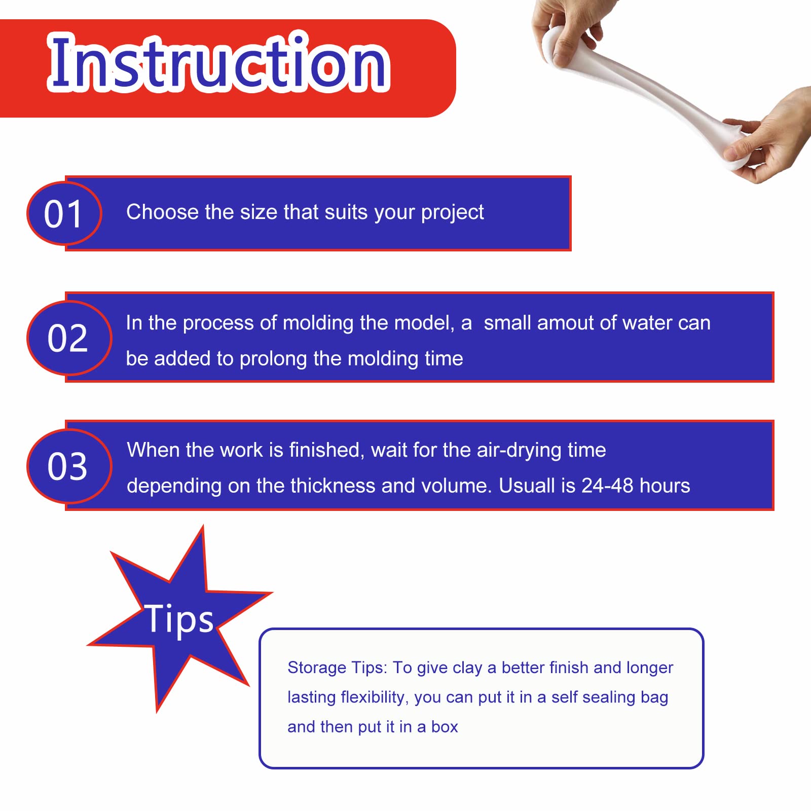 Good Adhesion and Air Dry: Use foam clay to easily attach it to other surface types, such as foam, wood, tile, fabric, ceramics, etc.The clay foam needs 24-48 hours to dry, depending on the thickness and volume. When foam clay has a wet feel, you can make it up at random and finish your crafts.