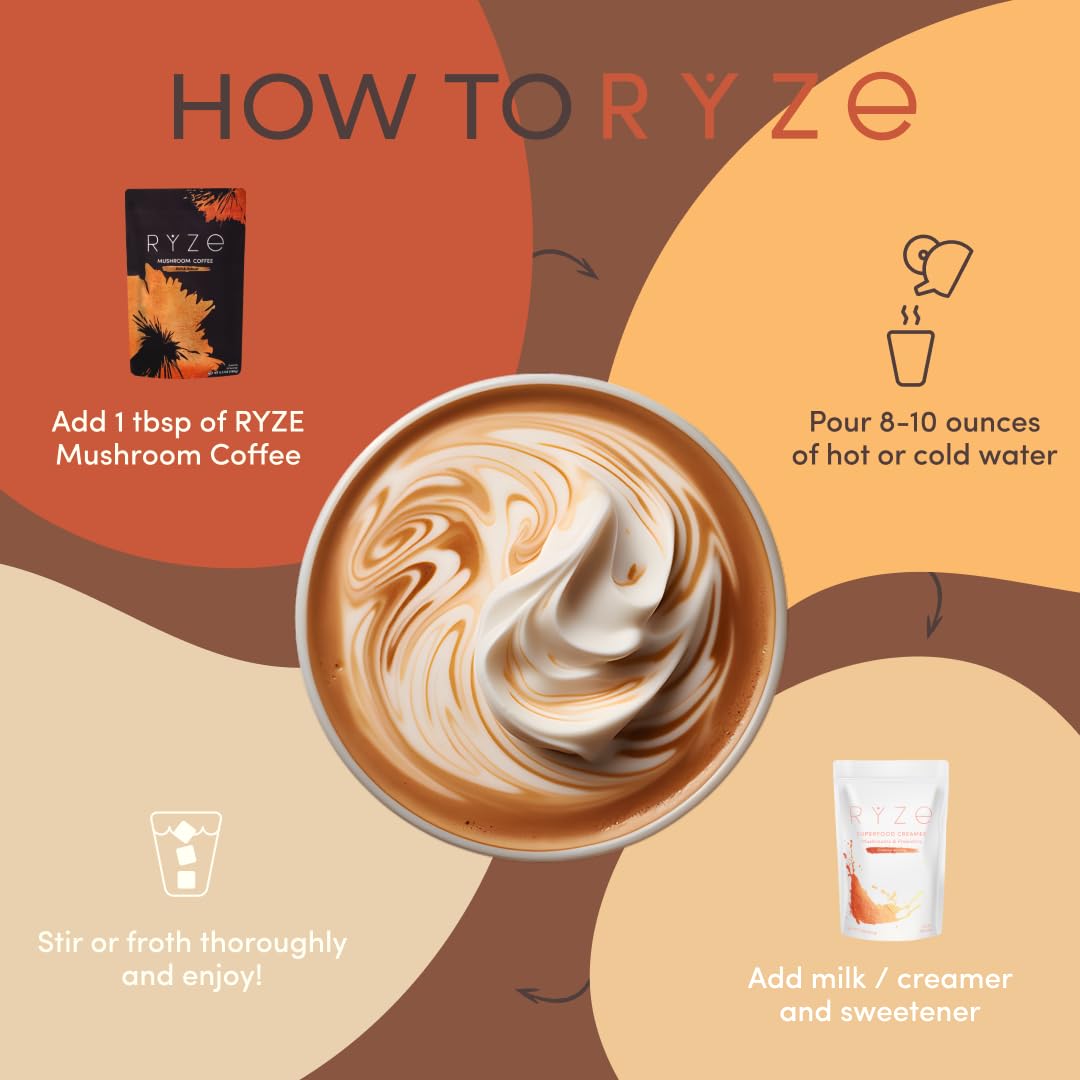COFFEE, BUT BETTER: Our signature mushroom coffee blend, now in a dark roast. Rich & robust flavor with 90mg of caffeine to fuel your day. Powered by 6 adaptogenic mushrooms, RYZE Mushroom Dark Roast Coffee supports you with all the energy and focus of regular coffee, with none of the jitters & crashes.