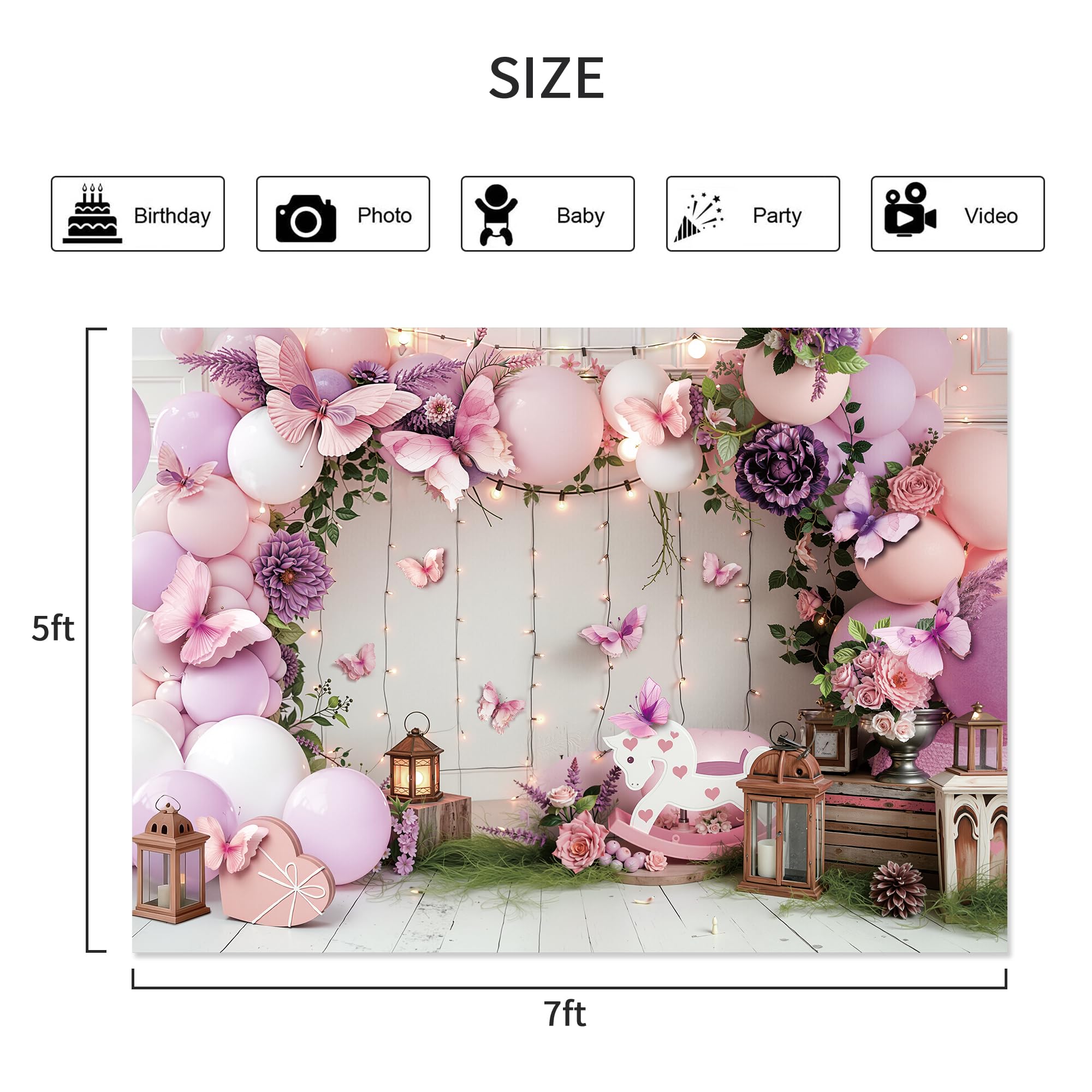 Balloon Butterfly design decorative muted tonal purple pink. This modern designer backdrop is made of polyester fabric, Eco-friendly. ▶SIZES: 7Wx5H feet. We provide special custom service. Other size or pictures you want to custom and print, please contact us before payment. ▶UNIQUE DESIGN: Girl Purple Pink Balloons Butterfly Blossom Flower Leaves Light Princess Bday Party pattern, modern. ▶USAGE: Desktop decoration backdrops, perfect for baby shower, wall decoration, photography, video backdrops. ▶MATERIAL: 100% polyester fabric. Portable, non-reflective, washable, may have few creases but easy to iron. ▶WARM TIPS: Item will be sent folded. If necessary, iron on a low temperature to remove wrinkles easily. Details: Material: Polyester fabric Pattern: balloon butterfly Size: 7Wx5H Weight: 0.5656 LB What’s Included: Photography polyester fabric(folding) ,background stand is not included. Notice: ★ All dimensions are measured manually with deviation (ranged) at 1-3 cm. ★Item may be a little different from the picture due to the lighting and your monitor’s display.