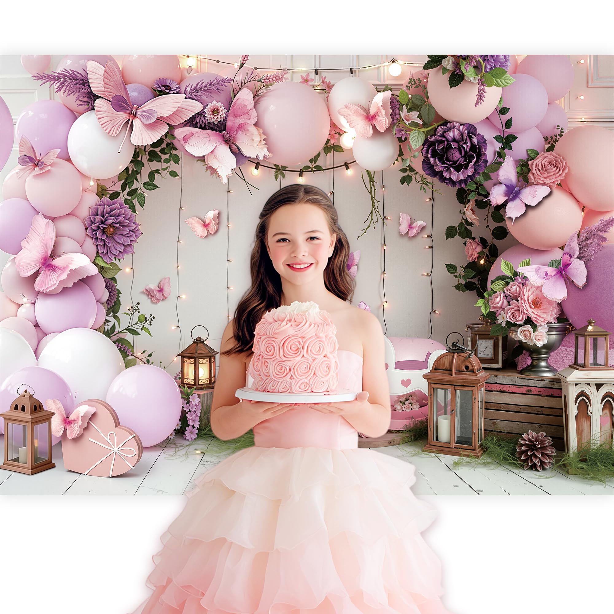 ▶UNIQUE DESIGN: Girl Purple Pink Balloons Butterfly Blossom Flower Leaves Light Princess Bday Party pattern,modern.