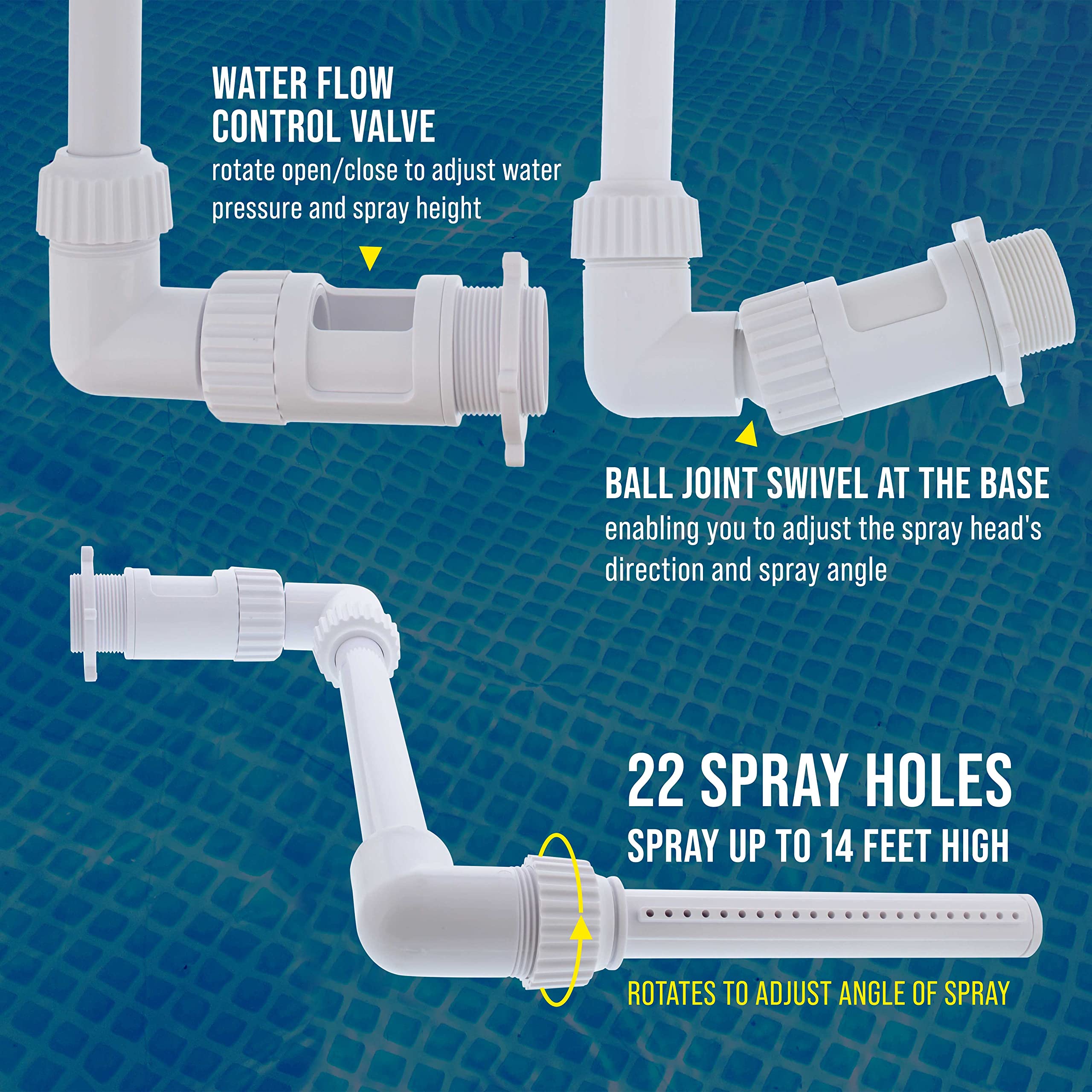 The fountain has a ball joint swivel at the base, enabling you to adjust the spray head's direction and spray angle. The waterfall's spray height can be adjusted by turning the water flow control valve at the fountain's base. The fountain can spray up to 14 feet high, depending on the power of your pool pump. The spray head contains 22 spray holes.