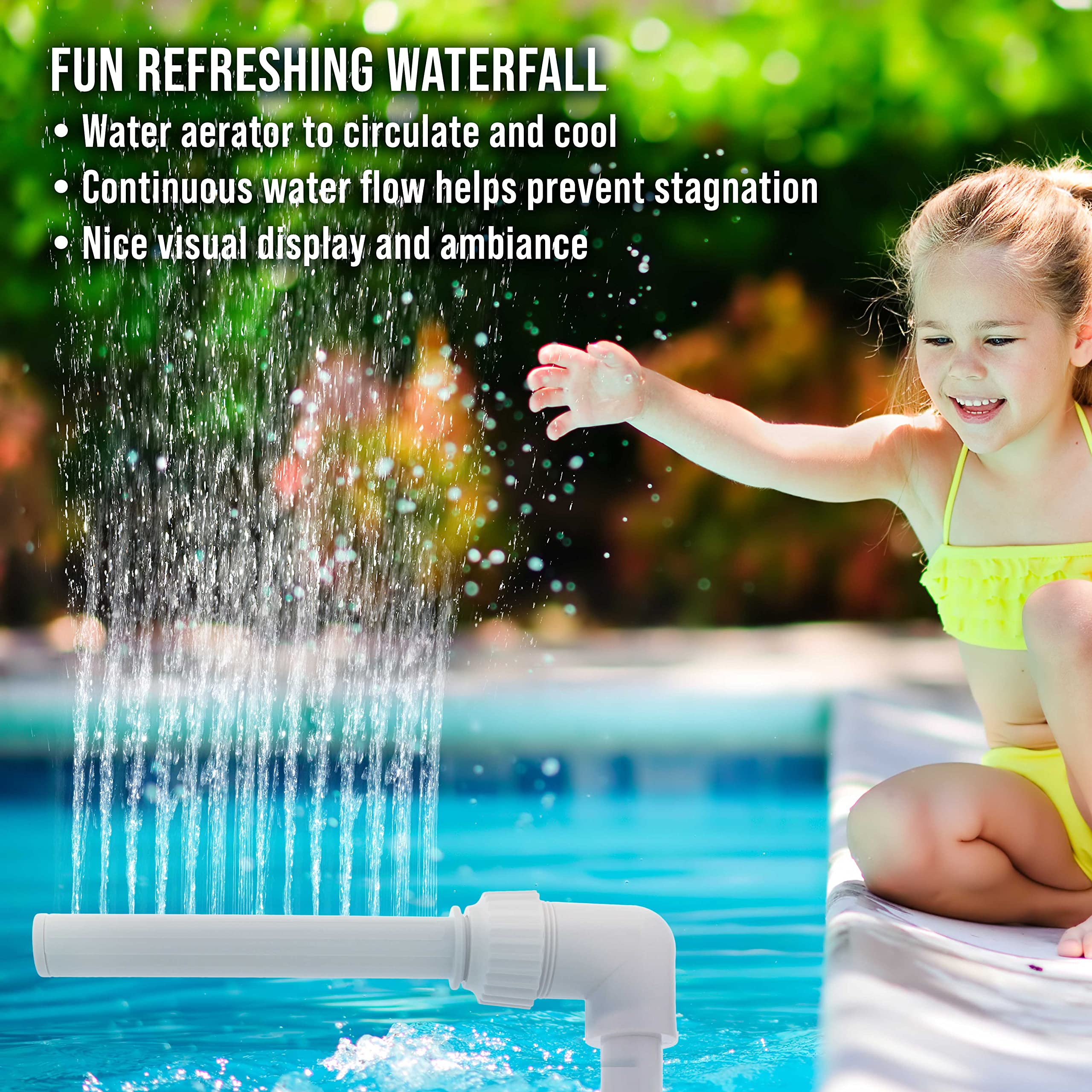 The fountains waterfall spray acts as a water aerator to circulate and cool the pool water's temperature during hot summer days. Continuous water flow also keeps your pool water from going stagnant. The fountains, soothing splashing, and its nice visual waterfall display create an excellent backyard ambiance.