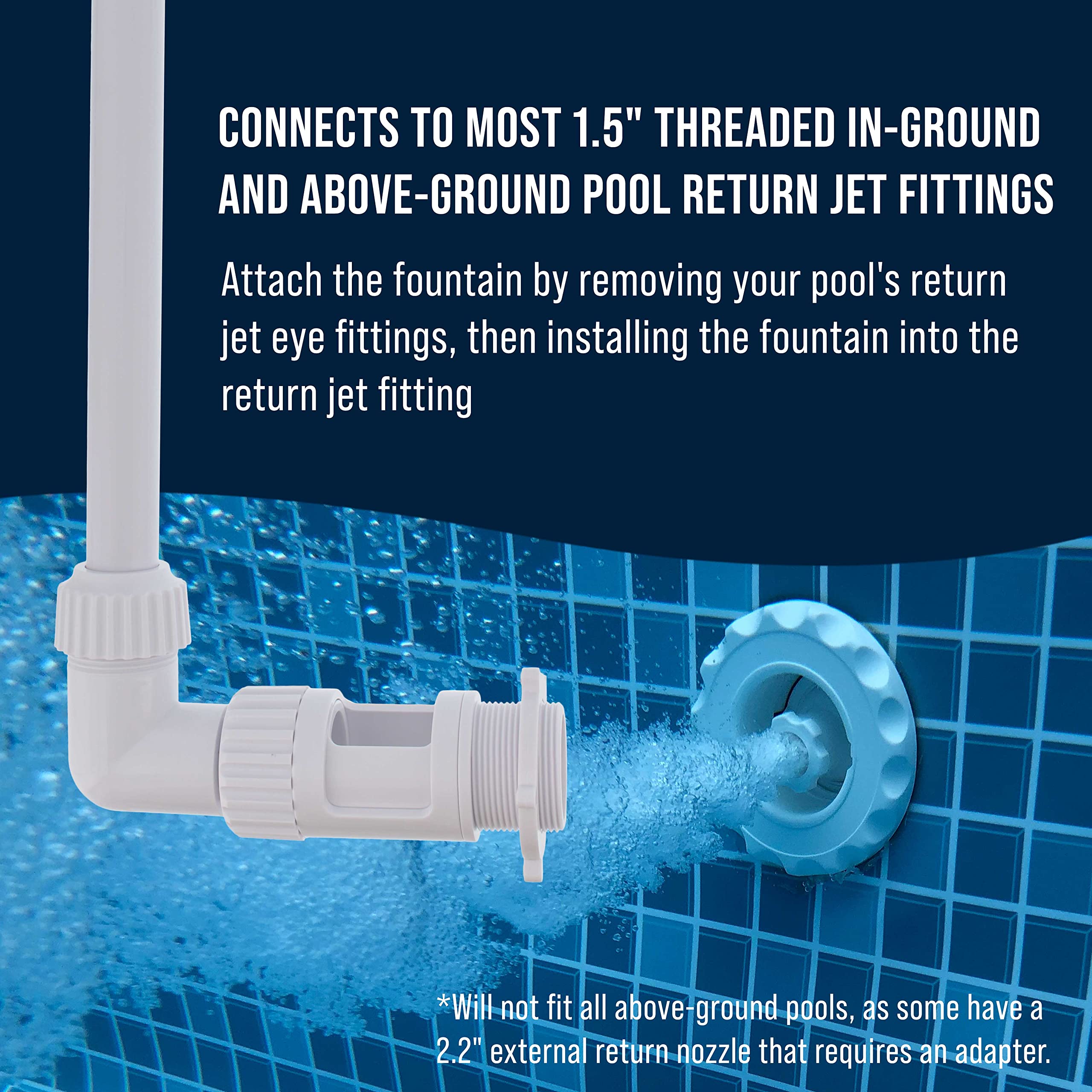 This sturdy, durable pool fountain connects to most 1.5" threaded in-ground and above-ground pool return jet fittings. Attach the fountain by removing your pool's return jet eye fittings, then installing the fountain into the return jet fitting. Please measure your pool return port size before ordering to ensure the proper connection. It will not fit all above-ground pools, as some have a 2.2" external return nozzle that requires an adapter.