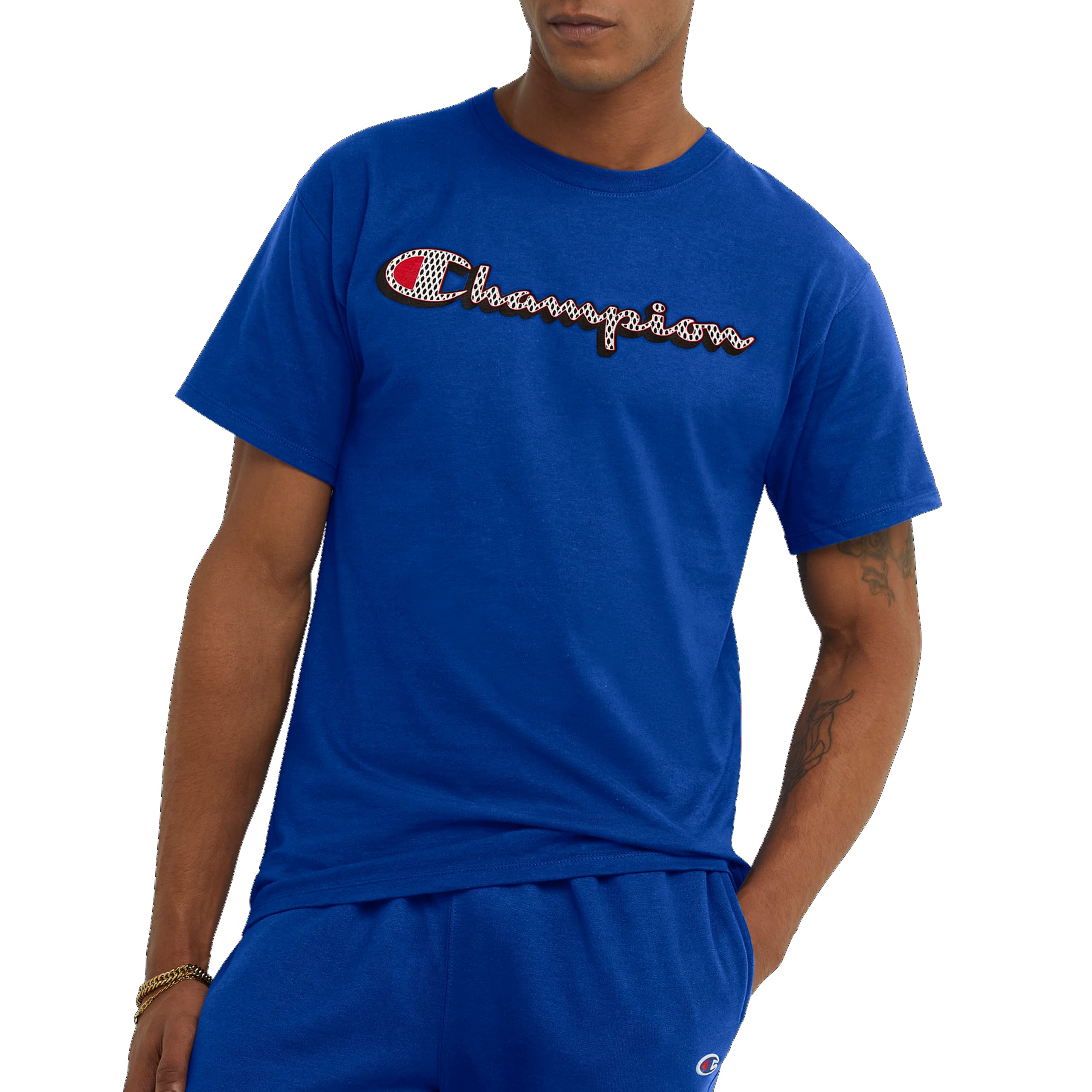 THE GRAPHIC - Drop shadow Champion script logo spans the chest.