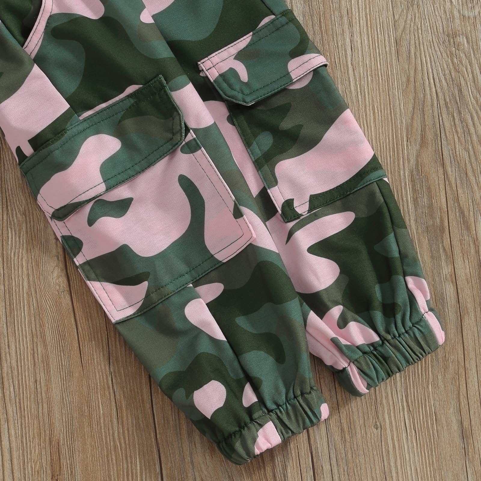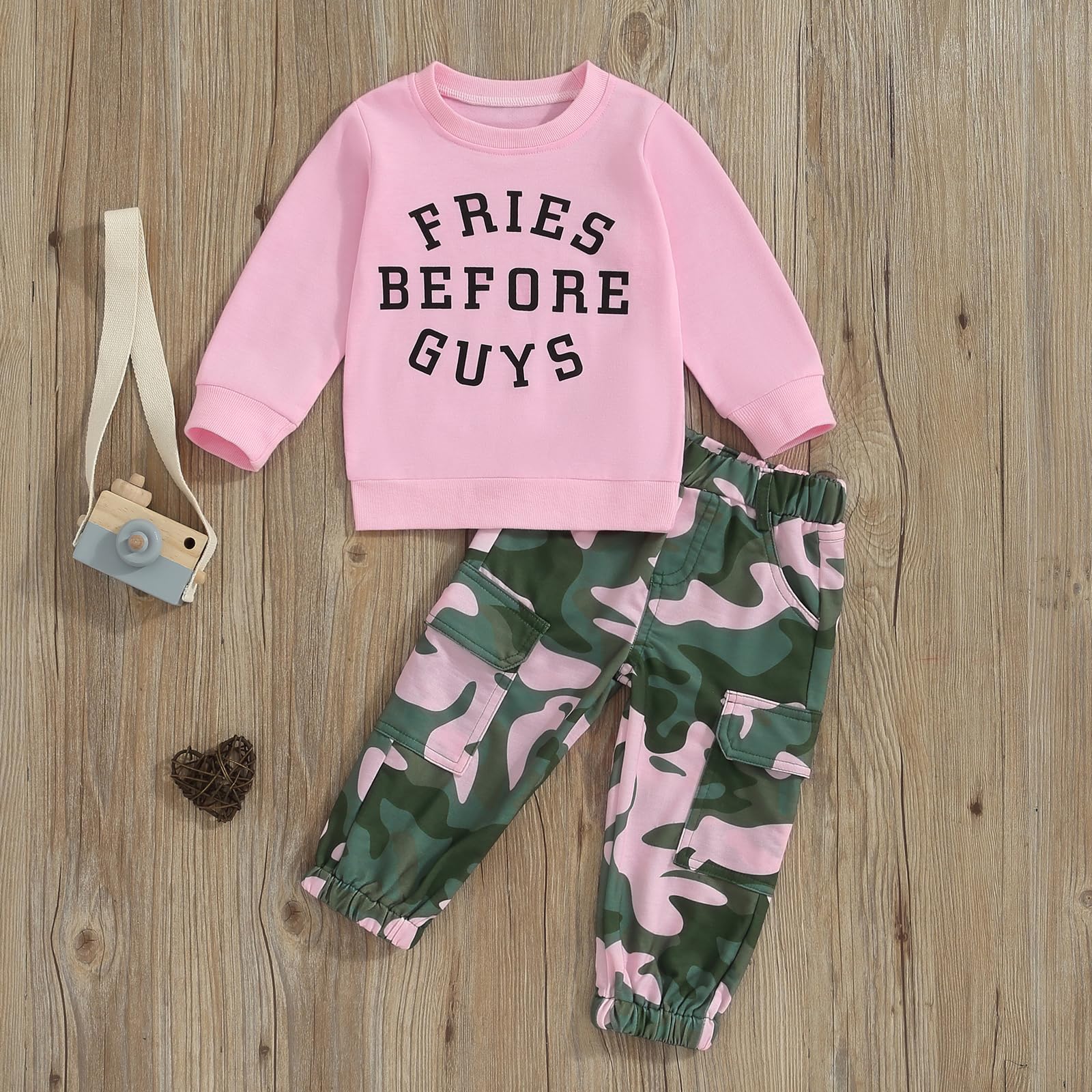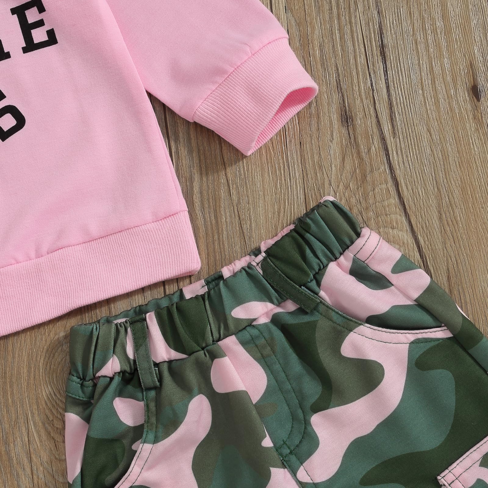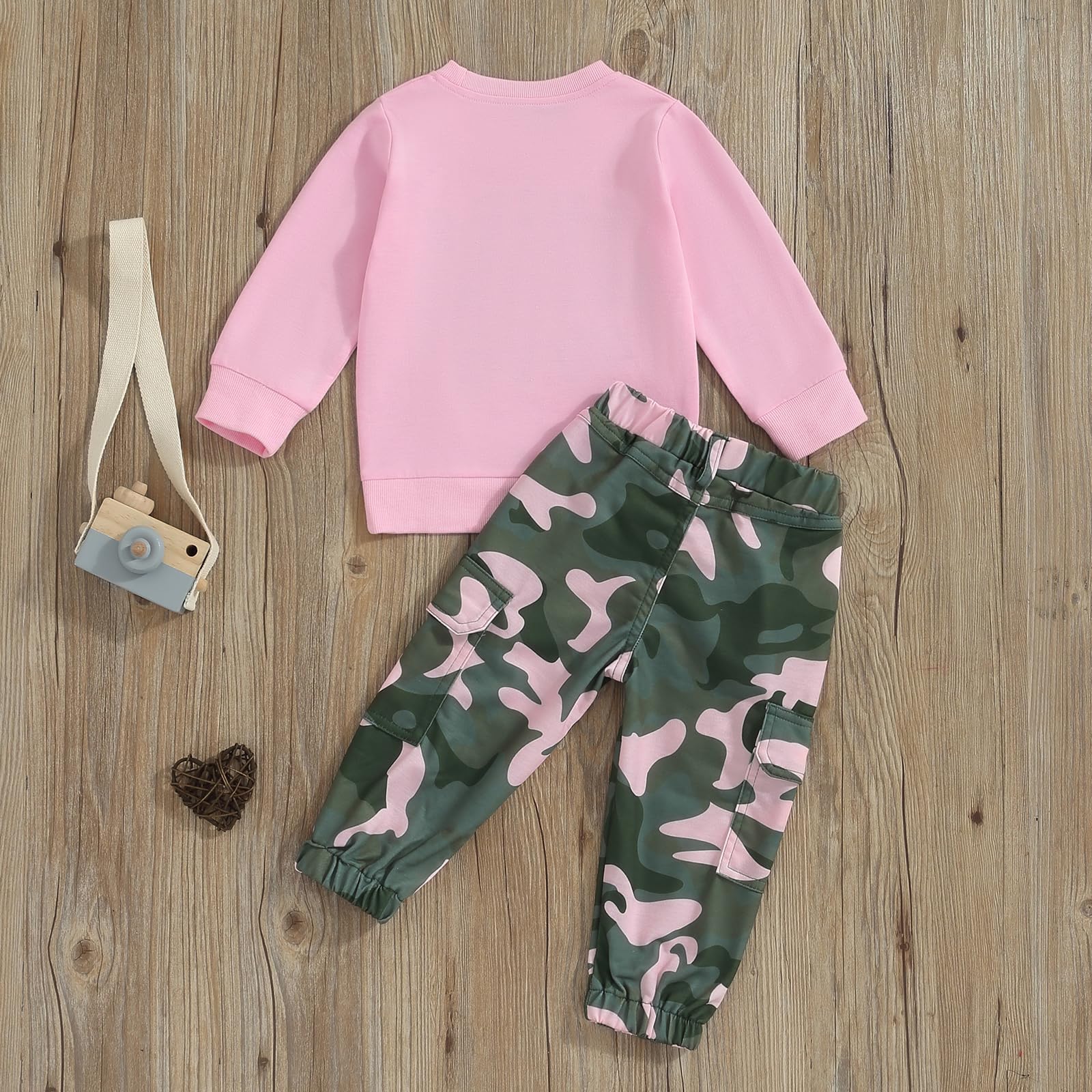 ♥Design: Baby girl fall outfits, pullover sweatshirt features letter print, long sleeves and a round neck. Trousers feature camouflage print and pockets.