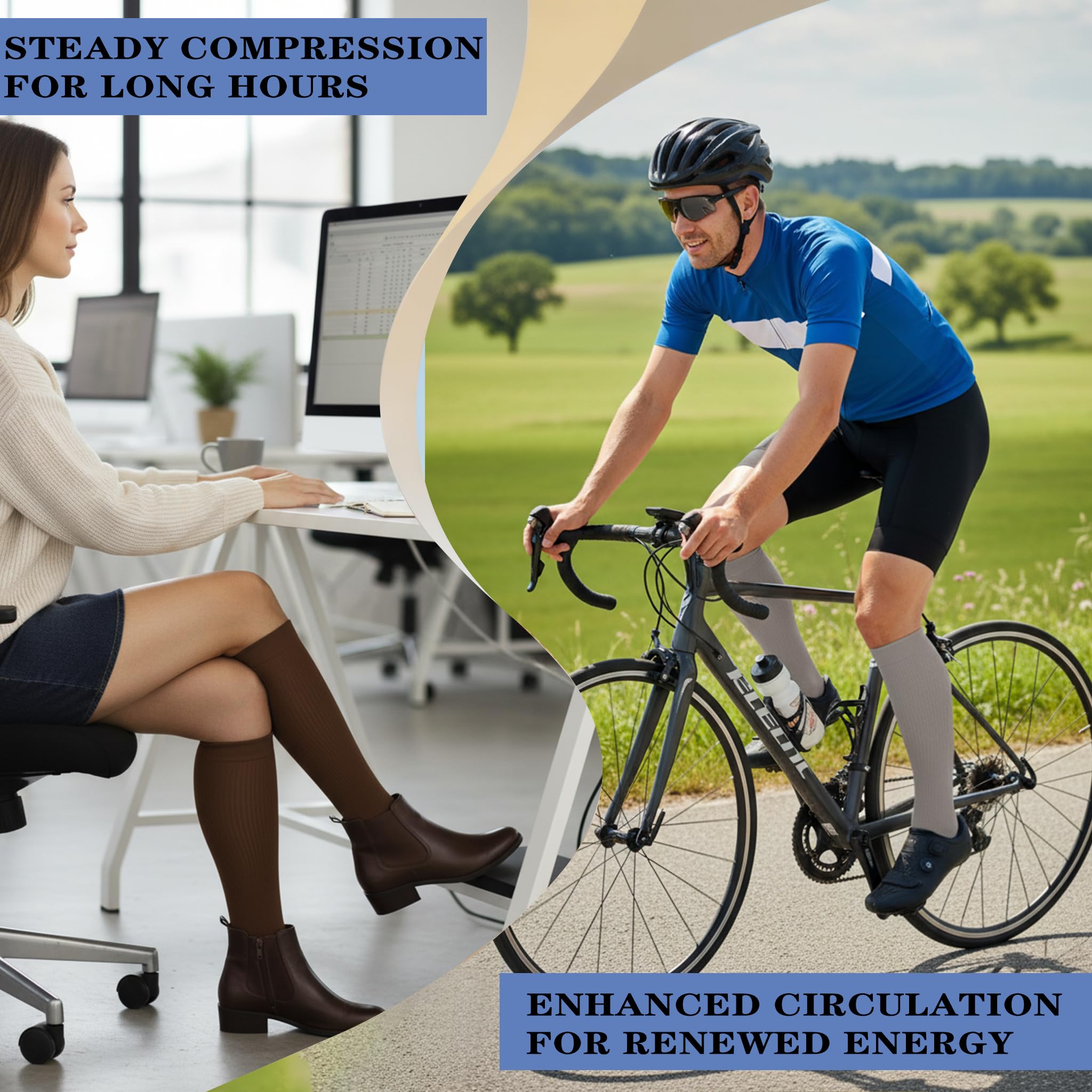 REDUCE INJURIES - Provide mild squeezing for warmness and enhance blood moving through your legs. Remove stress and stimulate every cell, relieves symptoms varicose veins and excess fluid retention. Help relieve pain & discomfort related to plantar fasciitis, Provides true graduated compression to support your legs, reduce fatigue, soreness, cramping and prevent injuries at the same time.