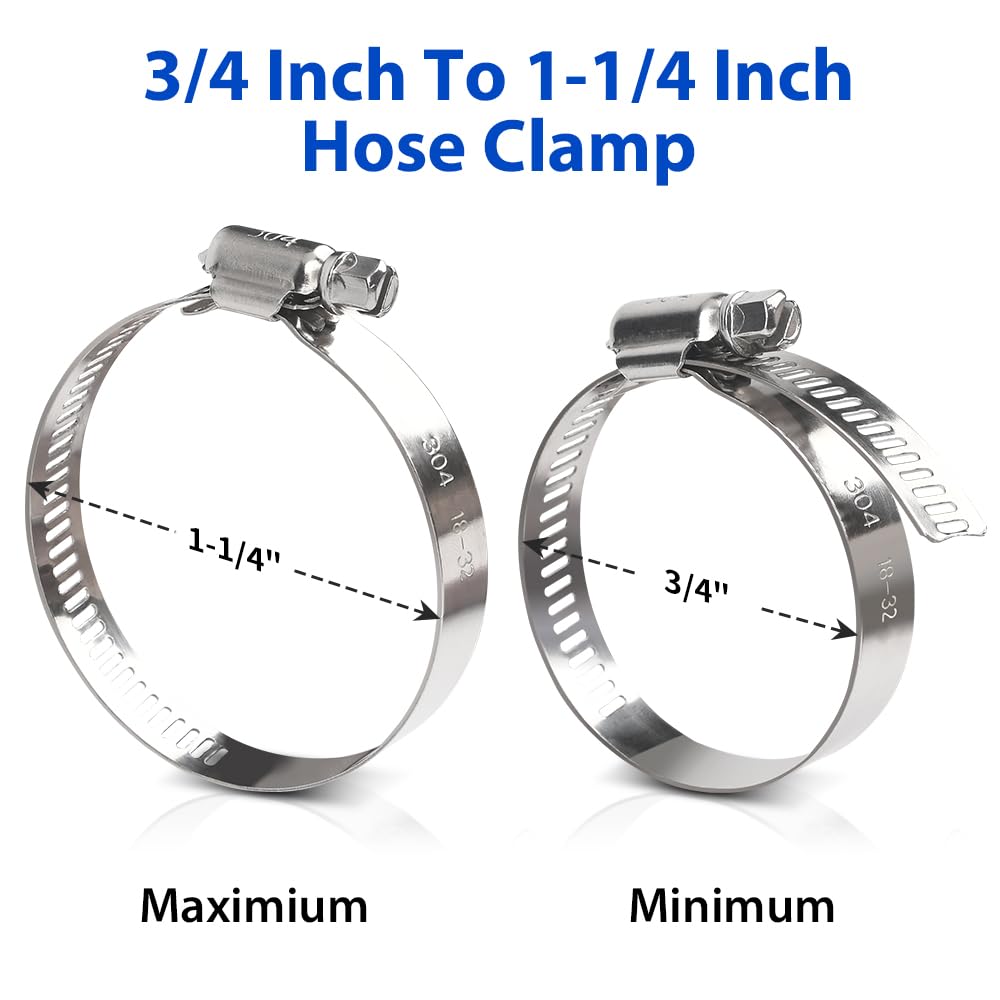 PACKAGE CONTENTS: 10 Pieces 1-1/4 inch stainless steel hose clamps designed to fit pipe sizes from 3/4 inch to 1-1/4 inch diameter(18-32mm)