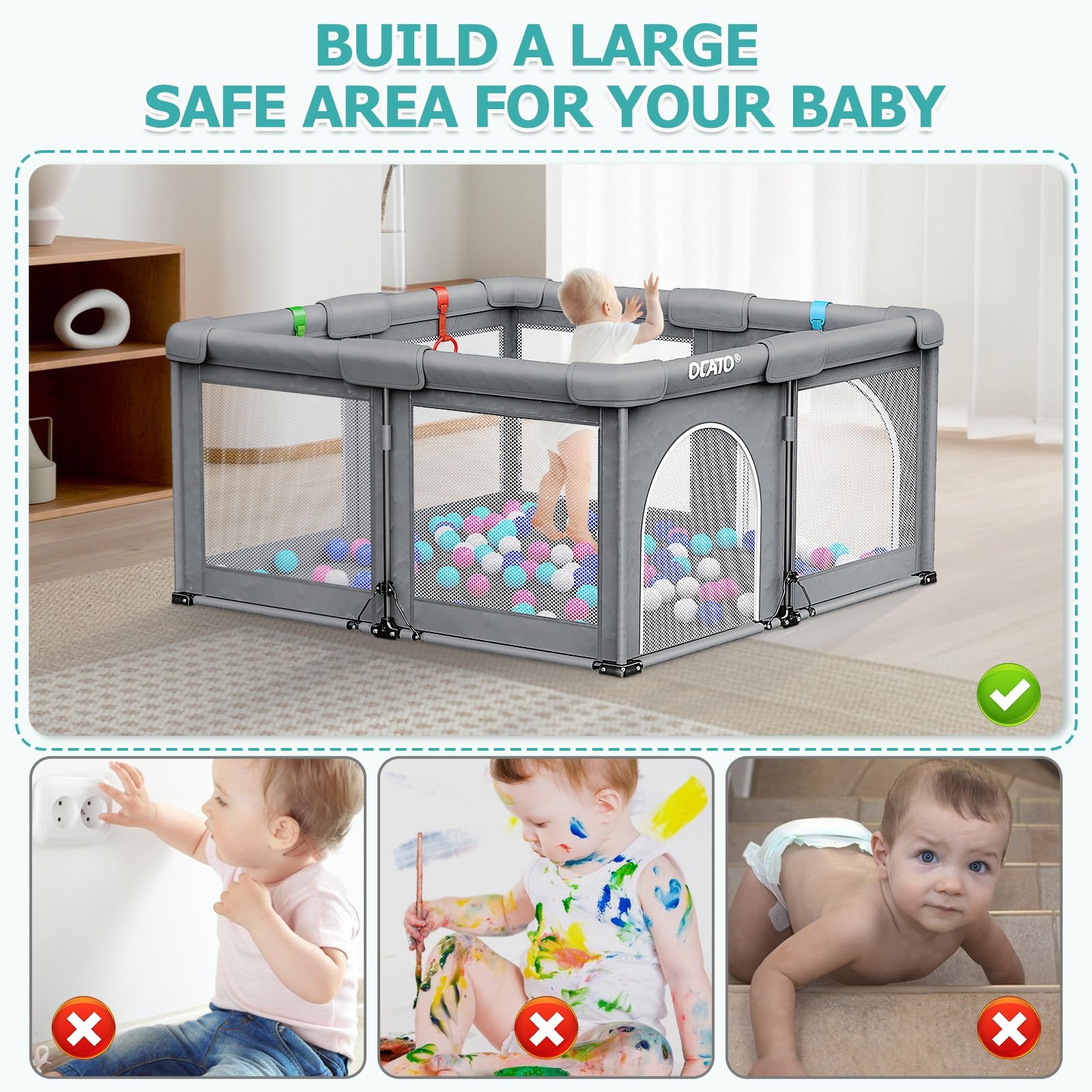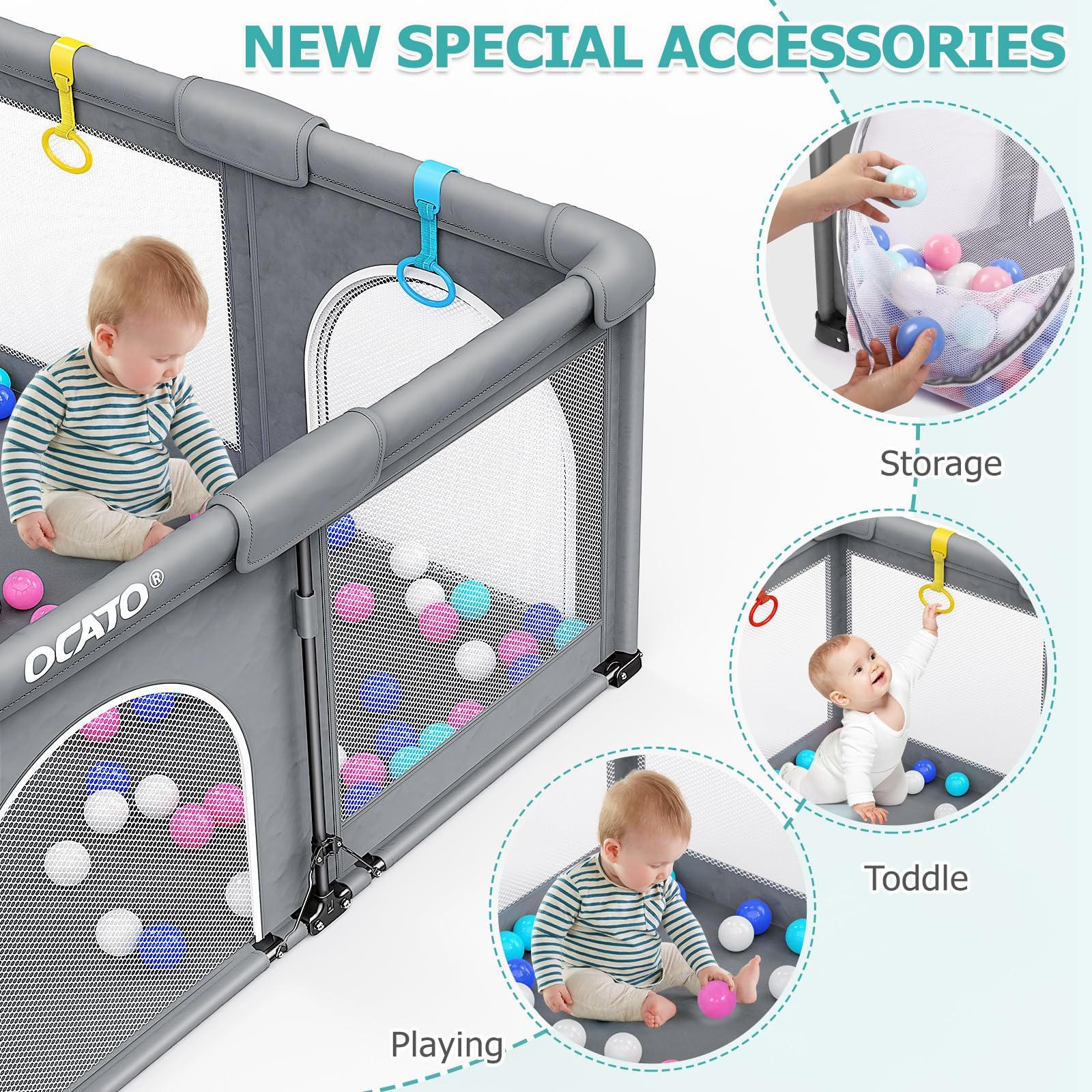 NEW SPECIAL ACCESSORIES: New upgraded baby gate playpen. Our playpen for toddlers added ocean ball x50, hanging ring x4, storage bag x1, storage strap x2. When the mom is busy, the baby can practice standing and walking through the hang ring, perfect size and height for babys to grip. Bright ball catches baby‘s attention, great entertaining extra large playpen for toddlers