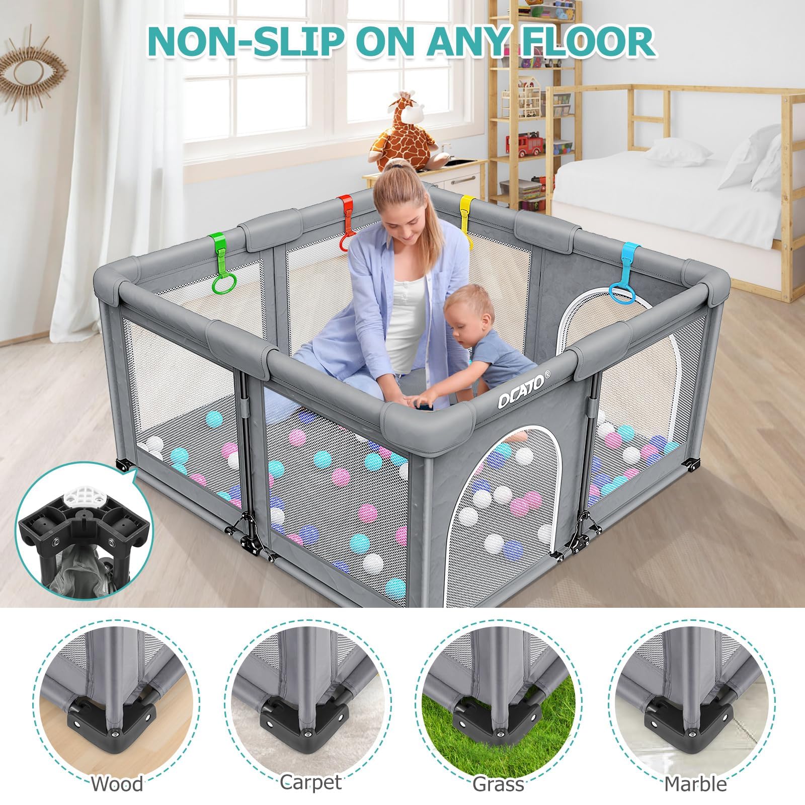 NON-SLIP ON ANY FLOOR: Non-slip base provides further stability. Suitable for any floor, such as wood, carpet, grass, marble, etc. Baby play yards maintain stability when baby is excited. For indoor and outdoor use, including home, park, grassland, beach. Spacious outdoor baby playpen that can accommodate multiple toddlers and parents. A quick pop up and lock system, four sizes complete, great play pen for toddlers 1-3 years, amazing chose for new parent