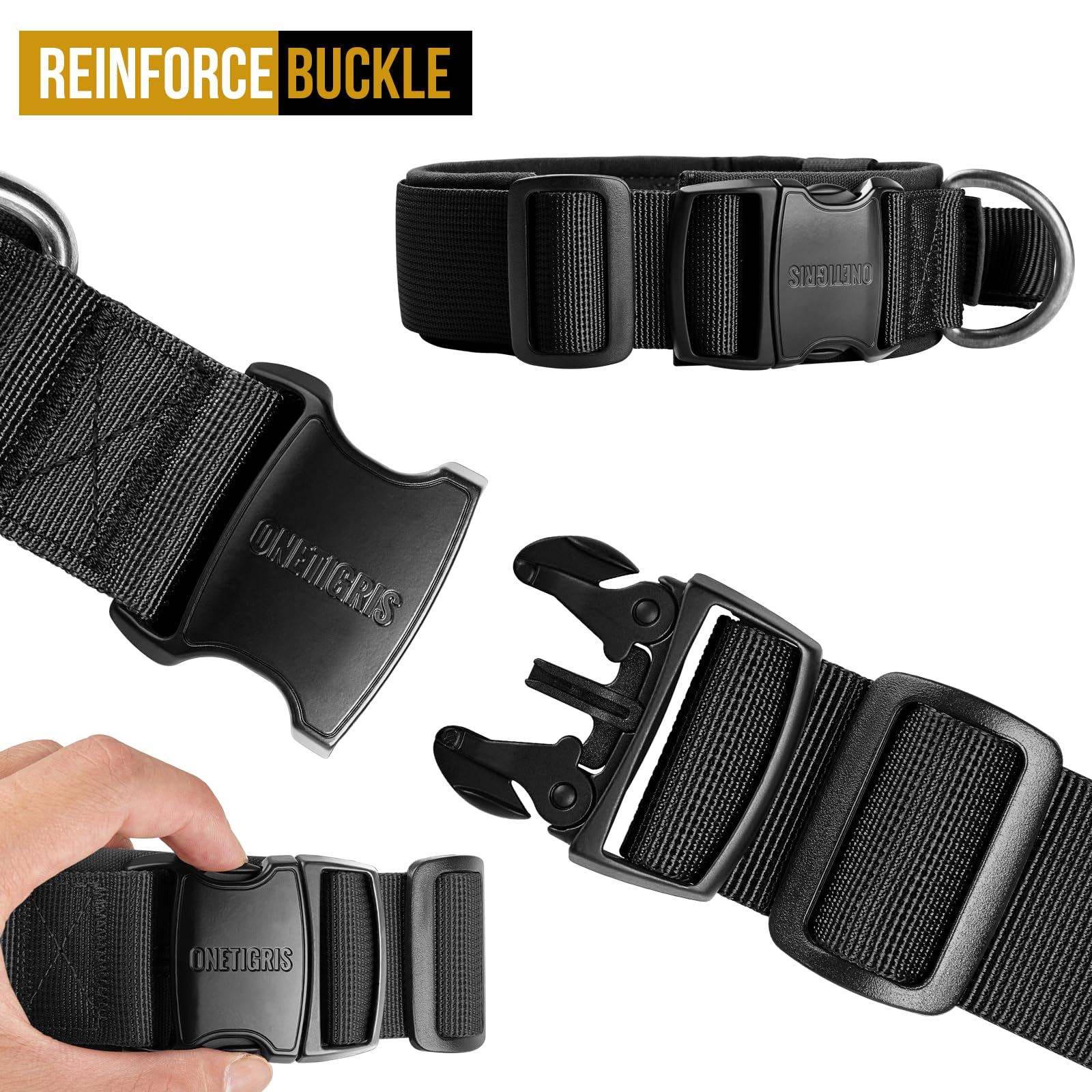 【Double Security】--Integrated collar button design for military training dog collar, one button to unlock, it’s easy to put on and take off, metal buckle is adjustable, you can change the length of collar based on your dog’s neck size