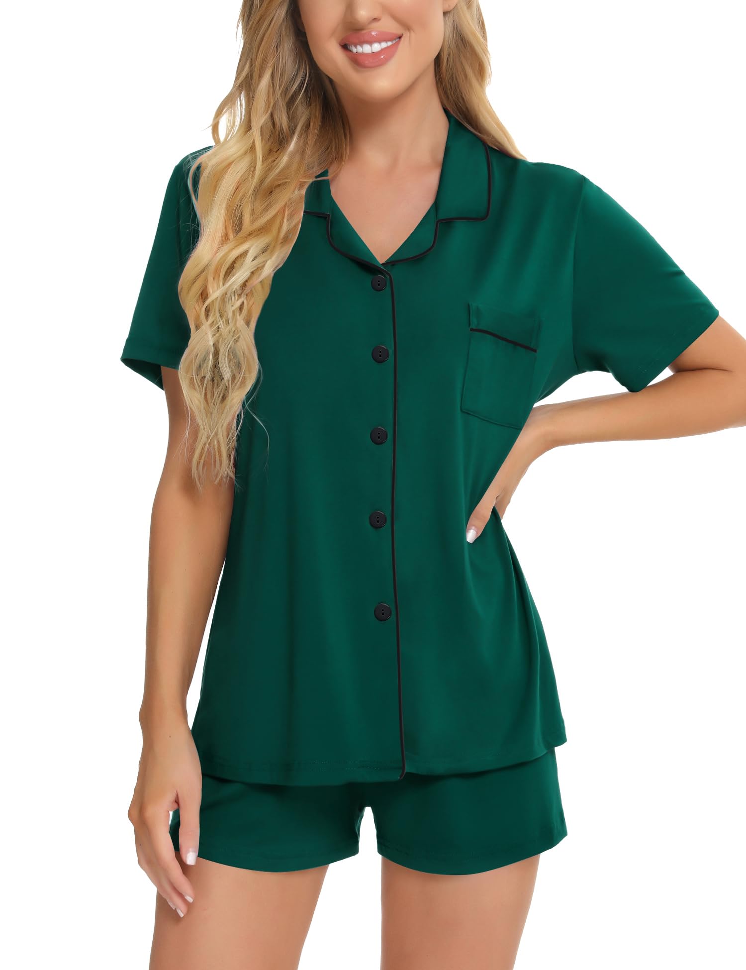 ❤【PERFECT FIT】Two-Piece Short sleeve pajama set with button front top and shorts for relaxed fit. Short sleeve pajama set features chest pocket, notch collar and contrast piping trim. It's slick and durable, bringing optimum comfort to your leisure time.