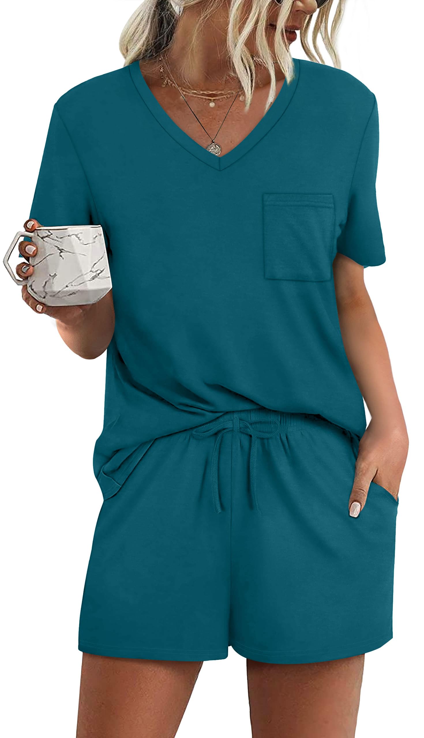 FEATURES: pajama sets for women 2 piece, pj sets for woman, V neck women's pajama sets, short sleeve T-shirt, drawstring elastic waist shorts.
