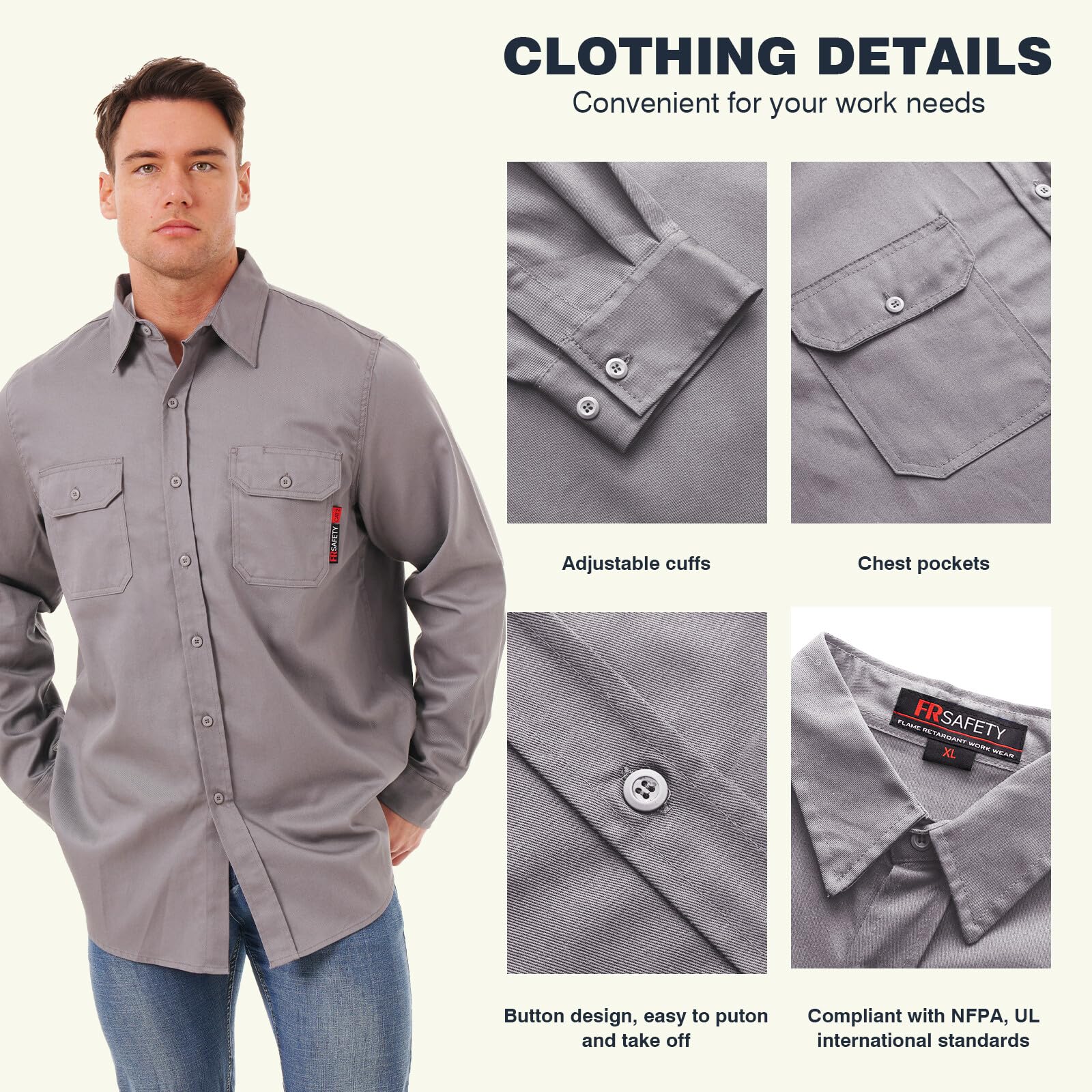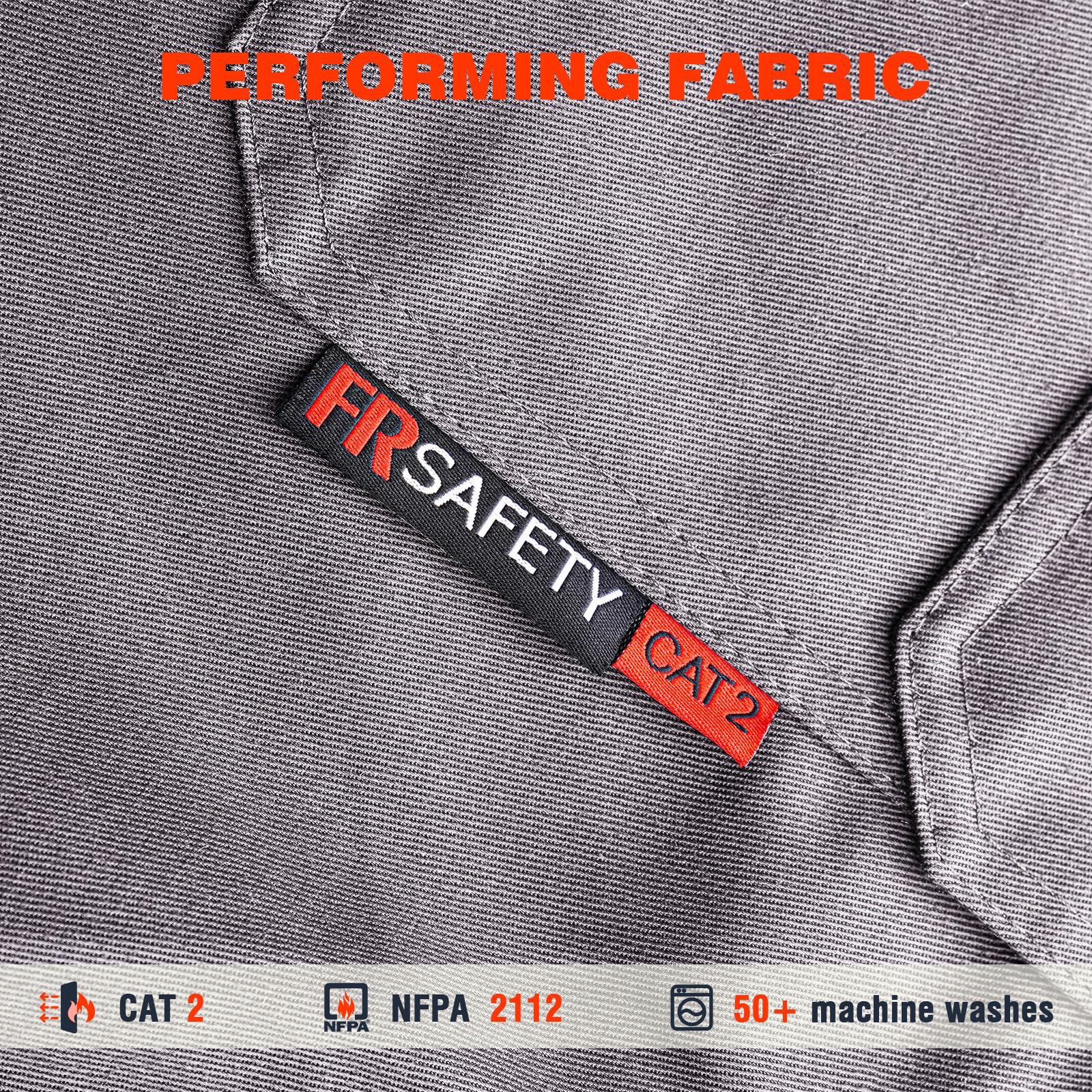 【Full protection】Arc Rating ATPV 9.3 Cal/cm², Fabrics, buttons, and seams are flame retardant.
