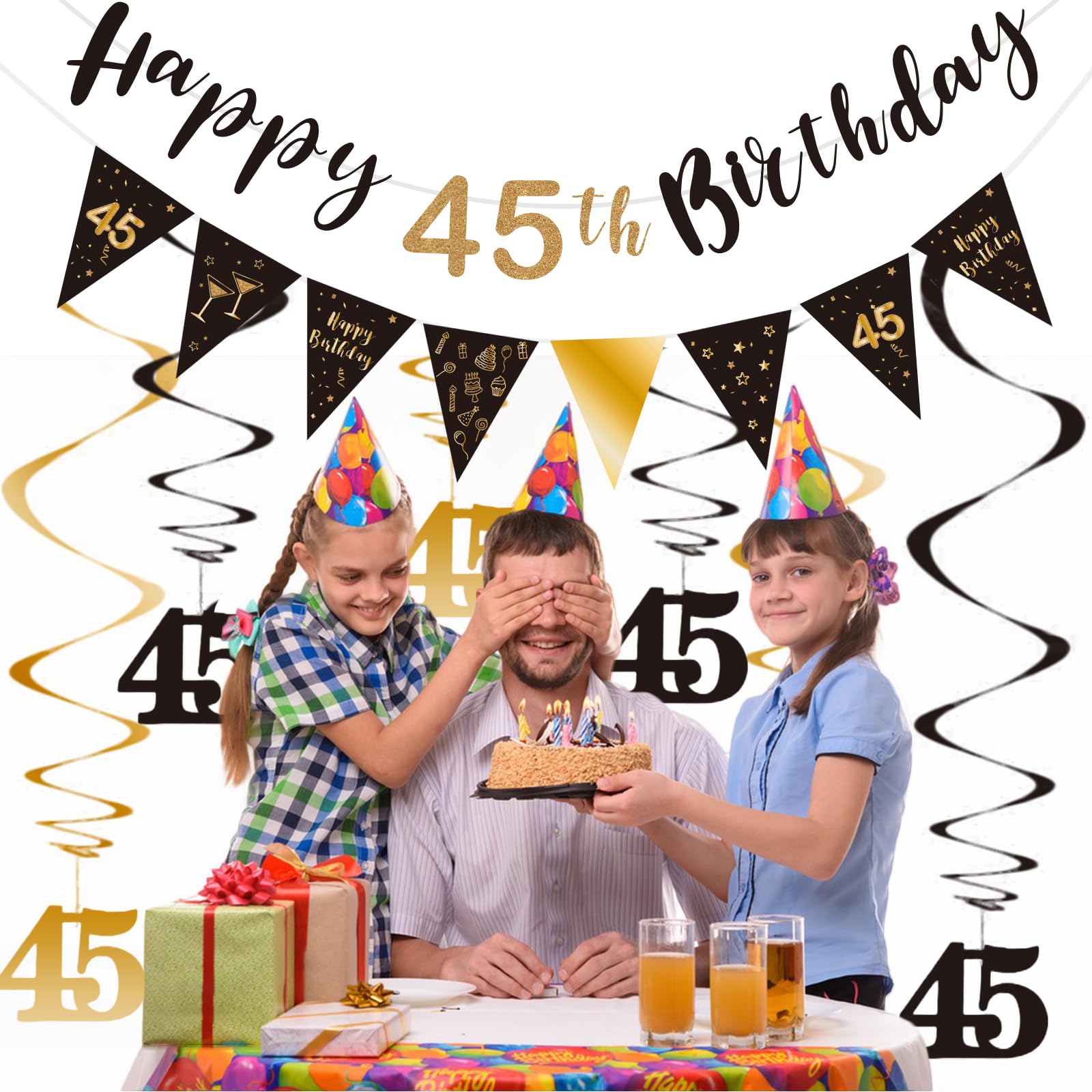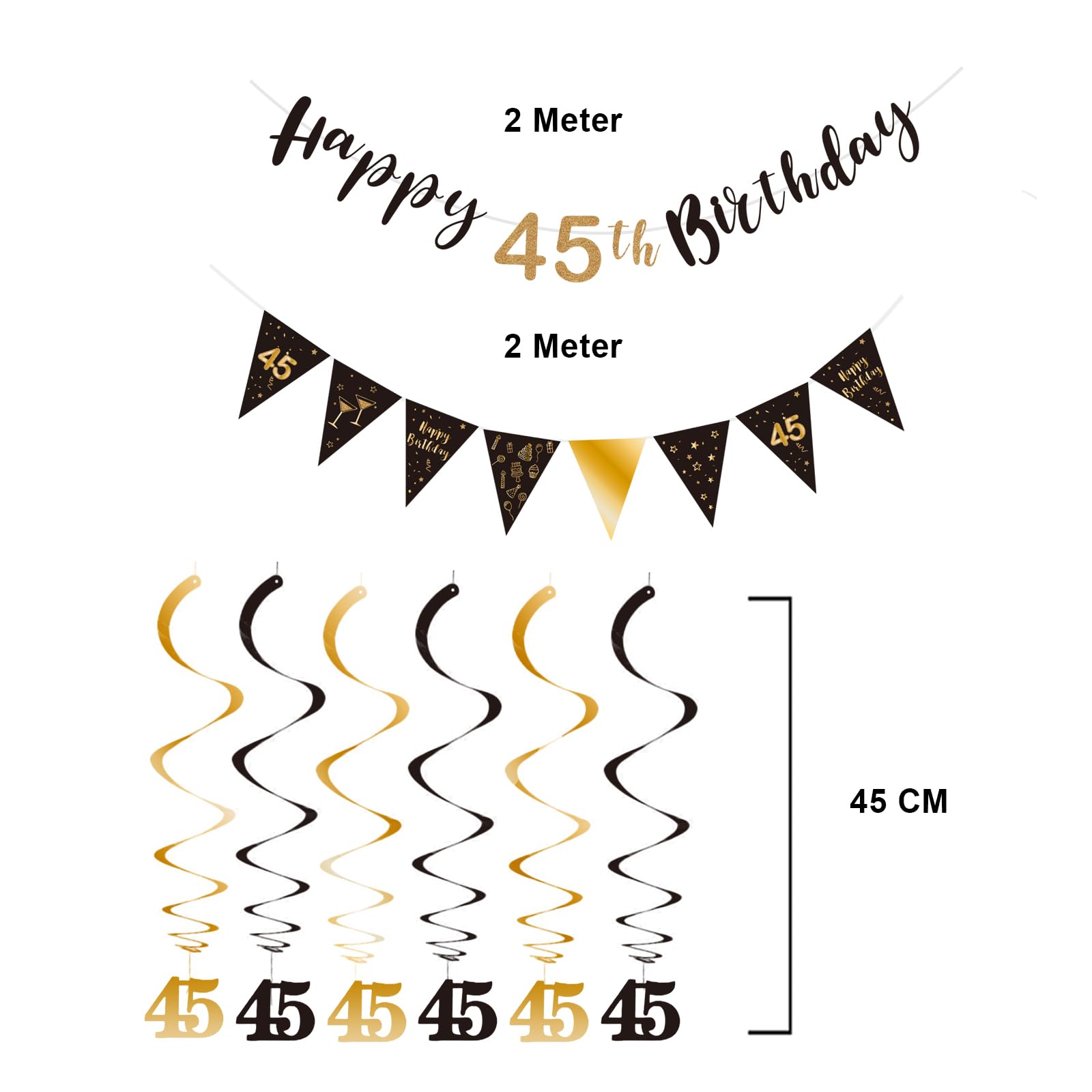 The package includes: Happy 45th birthday banner(1 set), triangle banner(1 set), hanging swirls(6 pcs).