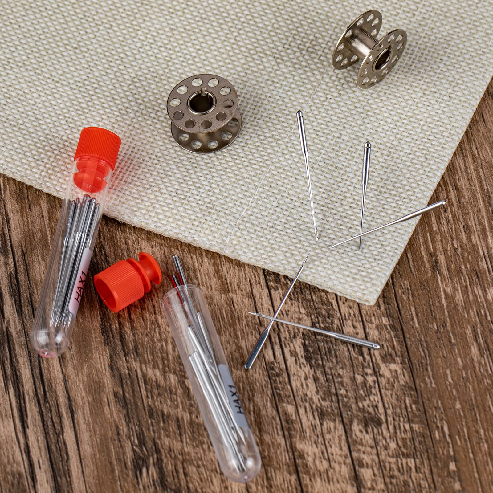 VALUE PACK & PERFECT SIZE:This set come with two sizes: 75/11, 90/14, 10 needles per size, total 20 needles. Also includes 2 storage tubes (free) and 3 bobbins (free).
