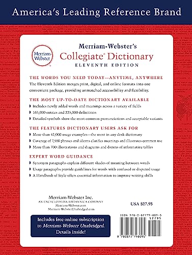Newly Revised & Updated! The Eleventh Edition of Americaβs Best-Selling Dictionary defines the current, active vocabulary of American English and is updated on an ongoing basis. Features more than 225,000 definitions and over 42,000 usage examples. Includes newly added words and meanings across a variety of fields including technology, entertainment, health, science, and society. Special sections include A Handbook of Style, Foreign Words and Phrases, Biographical Names, and Geographical Names. New words include: bestie, truther, Bitcoin, listicle, binge-watch, ransomware, takeaway, woke, hack, clickbait, and immersive. Includes a free one-year online subscription to Merriam-Webster Unabridged.com.