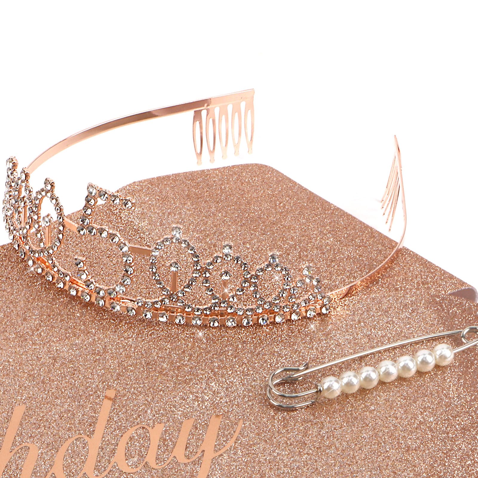 One Size Fit All - Birthday sash - Length: 61” (155cm), Width: 3.7” (9.5cm); Rhinestone Tiara are adjustable as well comes with comb design that can holds and stable and comfortable on top of the hair. Birthday sash can be fixed and adjusted in length with pearl pins .