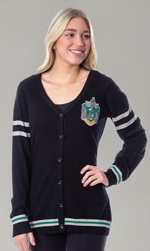 SLYTHERIN HOUSE CREST CARDIGAN - This Harry Potter Slytherin open-front cardigan has the house crest stitched on the chest. A varsity-style black sweater with gray stripes at the sleeves and waist. Six buttons are located on the front of the cardigan for closure