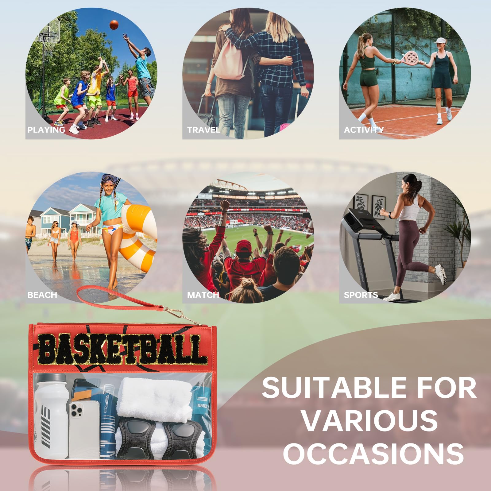 GLITTER CHENIL LETTER DESIGN: The basketball accessories bag's glitter chenil letter design with glitter border is fun and vibrant, making you stand out from the crowd. Transparent material combined with personalized design combines beauty and practicality, suitable for all occasions.