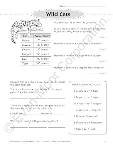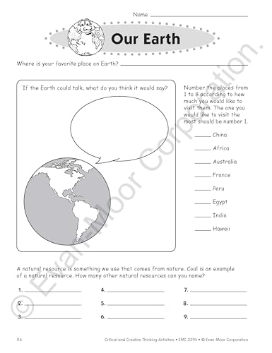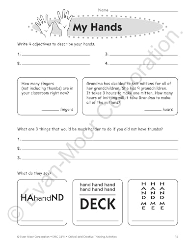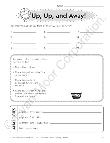 Evan-Moor Critical And Creative Thinking Activities Book of 140+ pages of fun, imaginative activities to practice thinking with variety of curriculum and theme based topics. It has 46 theme-based units with activities that fit the core curriculum like places: my room, my school, the supermarket, at the dinner table, eating out, in the car, on a walk, at the library, at the beach, on a field trip or nature in action: 6-legged crawlies, big birds, wild cats, ssssnakes, dolphins and whales, trees, mountains, caught in a storm and people: fictional characters, friends, family tree, who's in charge?. It also has fantasy: superheroes, elves and fairies, dragons, kings and queens, magic, mythical creatures or things i use: my bike, my pencil, my hands, the dictionary, locks and keys, manners, hats and caps and in my world: presents, chores, our earth, garbage, colorific!, cats and dogs, lost and found, up, up and away, help!, sticky stuff, rules. It is ideal for grade 4 students.