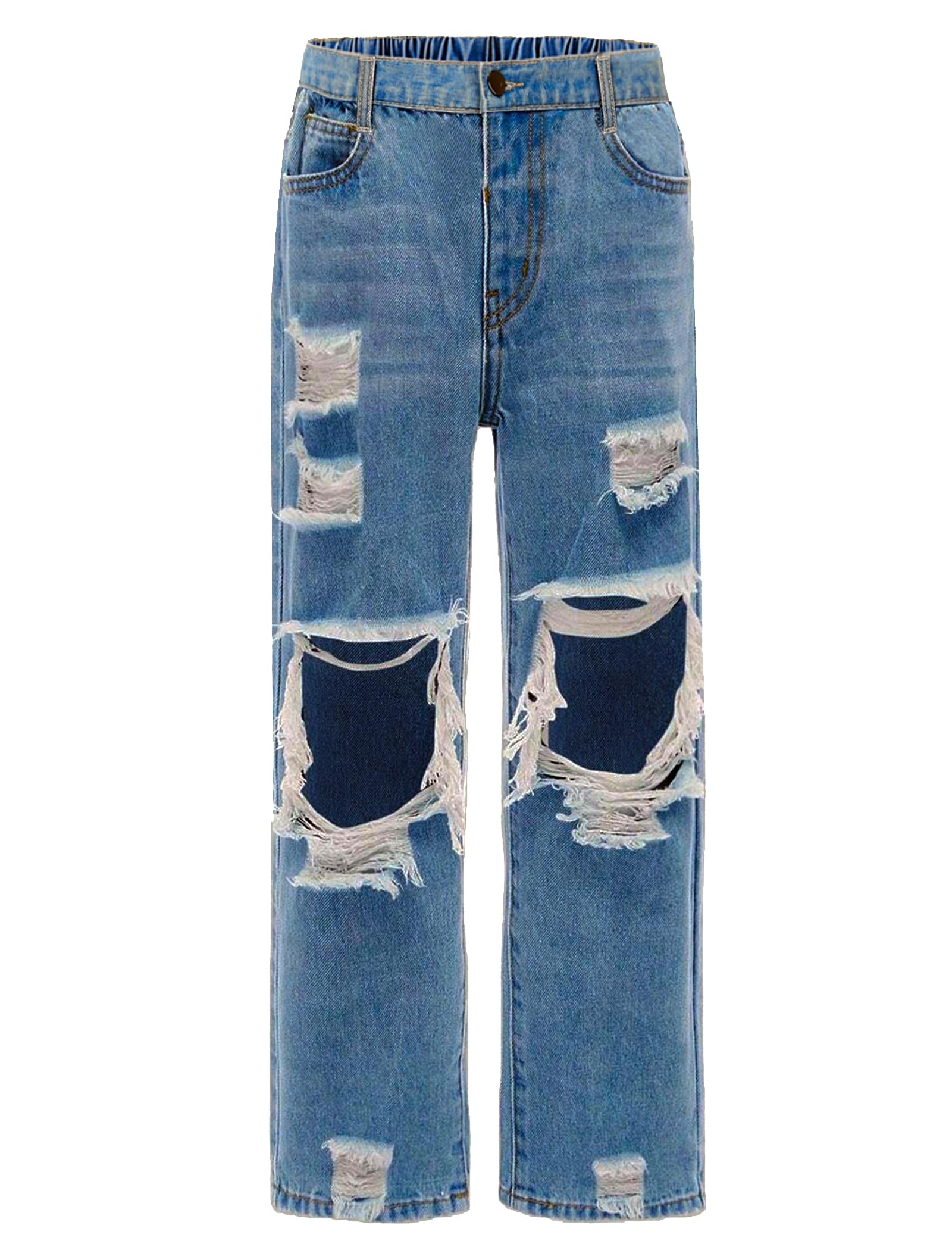 Ripped Straight Leg Jeans: Washed denim fabric creates these girls ripped jeans with an elasticized waist. High waisted loose fit pants leg straight and ankle length more show leg curves. The trendy ripped design at the thighs is even more fashion