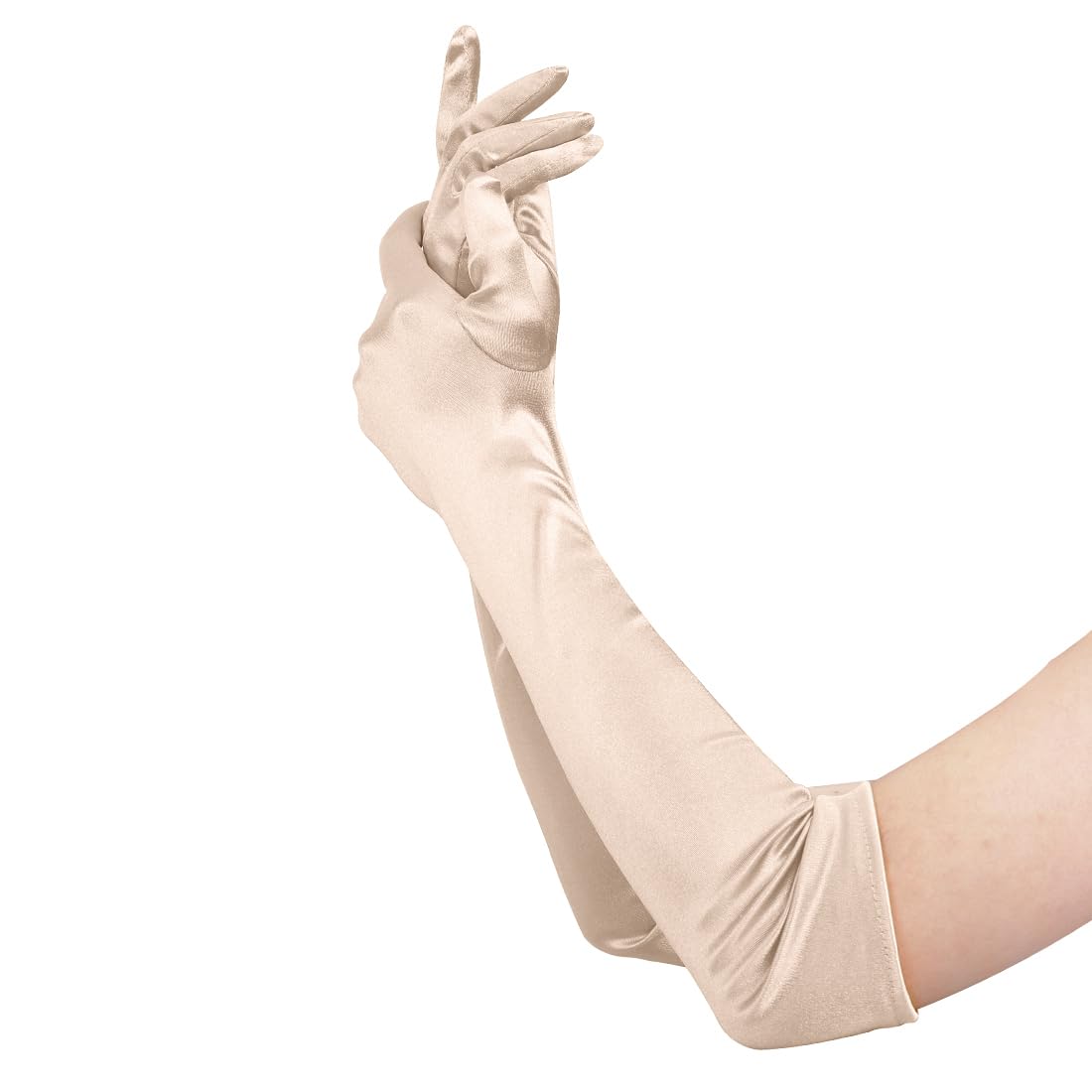 Description Women's White Long Satin Gloves Bridal Dance Gloves For Special Occasion Evening Party, Black, White, Pink, Red Material: Made of 90% Nylon + 10% Spandex, stretchy and easy to put on. Stretch ,soft, smooth, sleek, comfortable to wear The best to hand wash and air dry. Package include: 1 Pair Gloves.