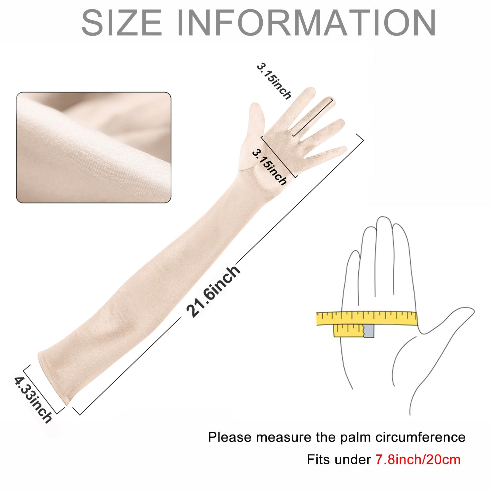 Dimension - The length of these opera gloves are approximately 21.6 inches from the fingertip to the end of the glove. The end width is 4.7 inches when laying flat, suitable for most adults.