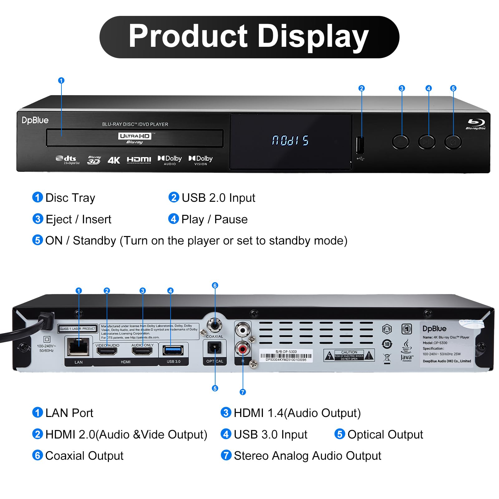 【TWIN HDMI OUTPUTS AUDIO/VIDEO SEPARATION】DpBlue 4K Bluray player features dedicated HDMI 2.0 (Video/Audio) and HDMI 1.4 (Audio only) outputs. This allows for optimized video transmission to your display and pure, uncompressed audio directly to your AV receiver, minimizing signal interference.