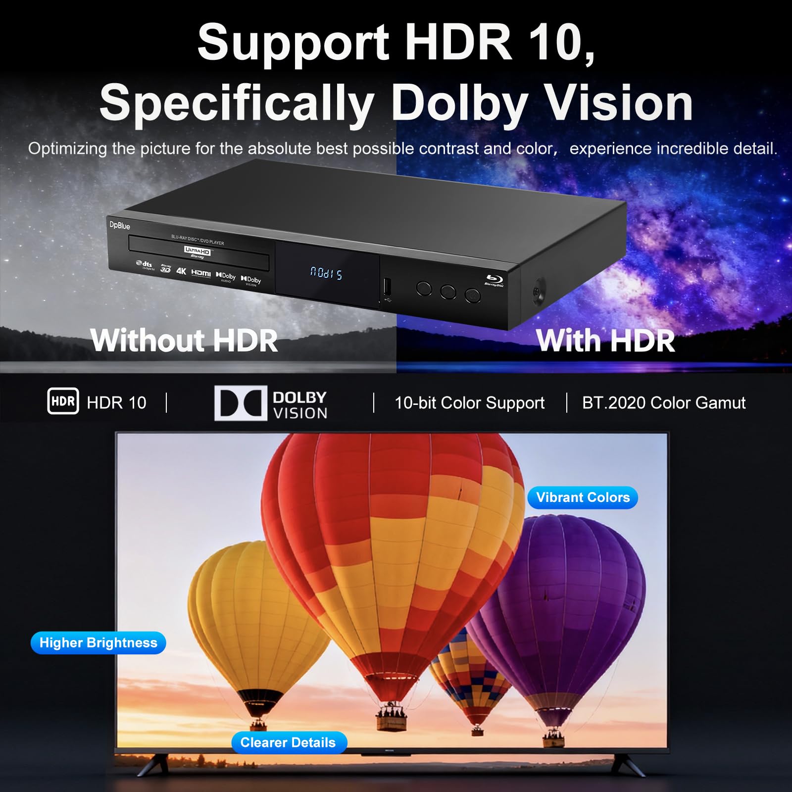 【SUPPORT HDR 10,SPECIFICALLY DOLBY VISION】Enjoy a broader spectrum of colors, superior contrast, and deeper blacks with support for HDR10, Dolby Vision, 10-bit Color and BT.2020 Color Gamut, ensuring every scene is displayed with stunning dynamic range and realism.Cinematic movie experience at home via this 4K 3D blu-ray DVD player.