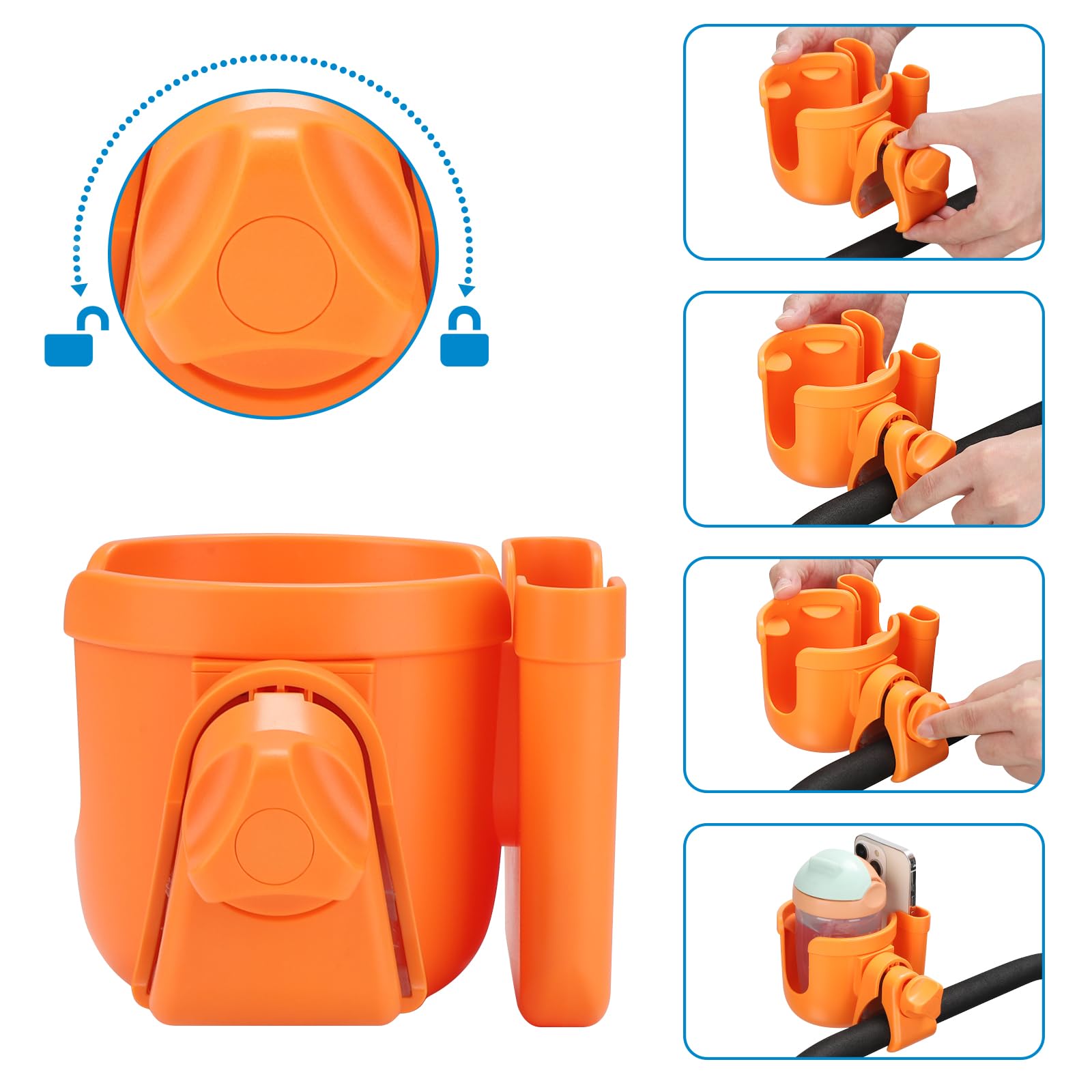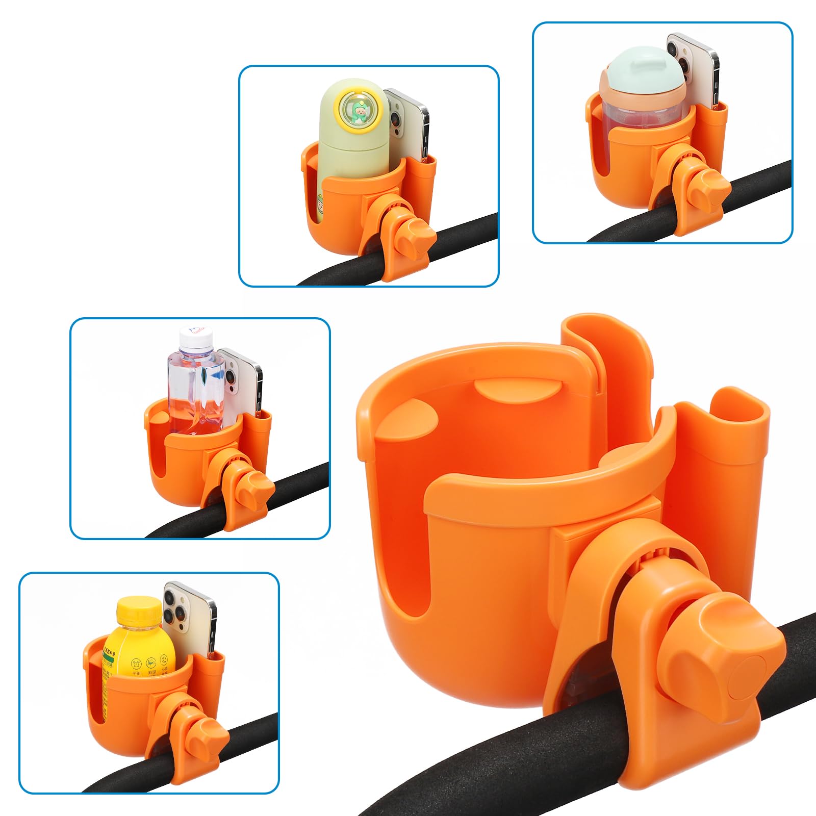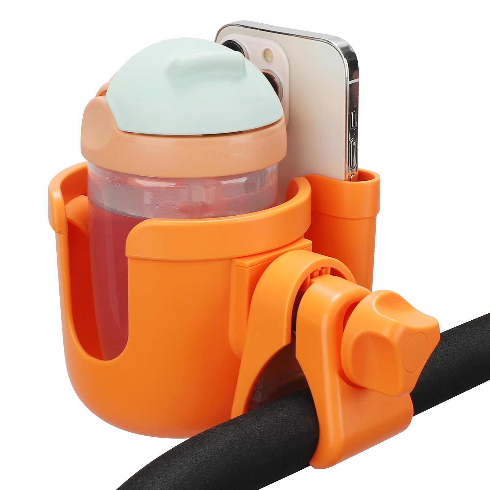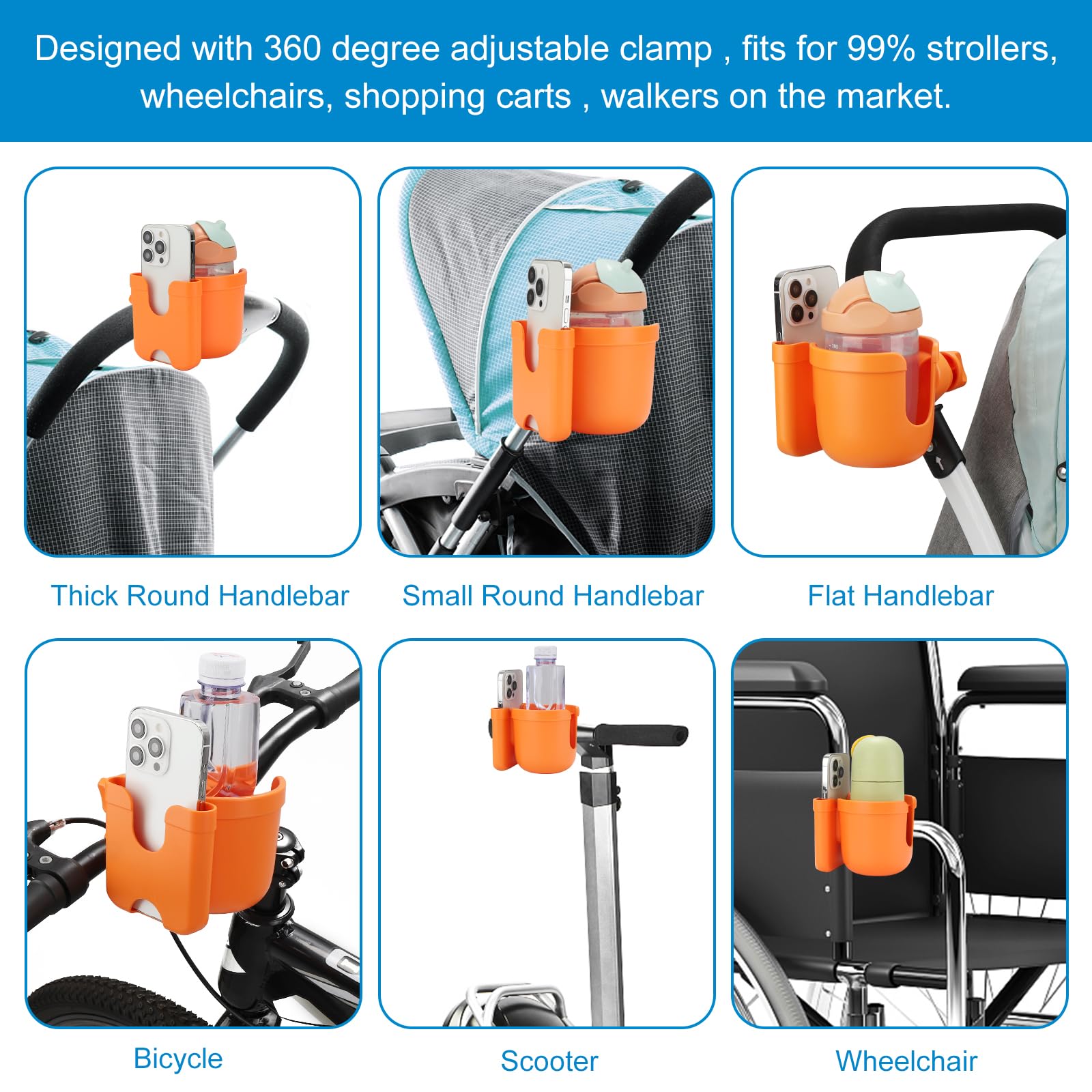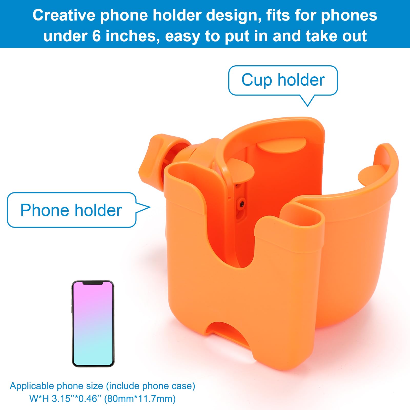 Wide Compatibility: This universal cup holder with phone holder compatible with most baby strollers, walker, wheelchair, rollator, bike, scooter, boat handle bar, shopping cart, kayak, ATV, lawnmowers, motorcycle, treadmill, golf push cart and so on.