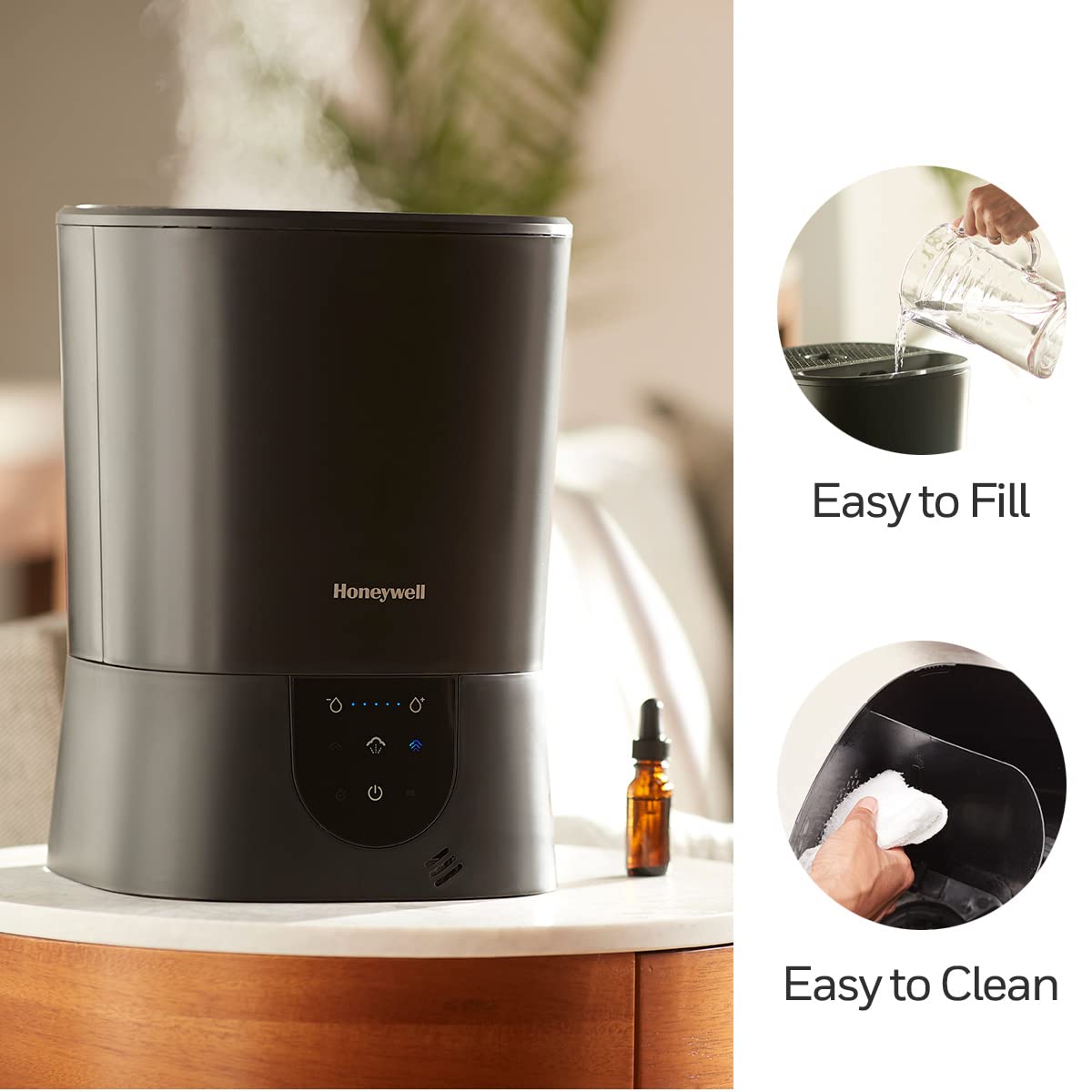 The Honeywell Filter Free Warm Mist Humidifier provides relief from dry air discomforts in medium rooms. Indoor humidity levels between 40-60% can help relieve cough and congestion, keep throat and nasal passages hydrated, temporarily relieve dry air discomfort, protect furniture, reduce static electricity and even keep plants healthier. This Honeywell humidifier is quick and easy to use and clean. The filter-free operation allows for long-lasting use without the costs of replacing a filter, while the top fill water tank opening makes for easy filling and cleaning. It’s a warm mist humidifier that features a programmable humidistat with 5 humidity settings that quietly produce steam in less than 1 minute, as well as 2 comfort settings with auto shut-off when the tank is empty. Plus, the essential oil cup allows for your favorite essential oil or liquid inhalant to be added. It’s ultra-quiet, making it a great choice for your bedroom or as a baby humidifier for nursery or kids’ rooms.