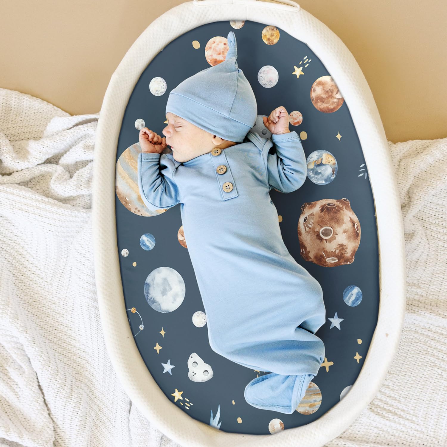 Universal Fit – Measuring 32" x 16" x 5". Our bassinet sheets fit almost all standard oval, round, rectangle, hourglass shaped bassinet mattress. Each bassinet mattress pad cover comes with an elastic band encased at the bottom for safety.