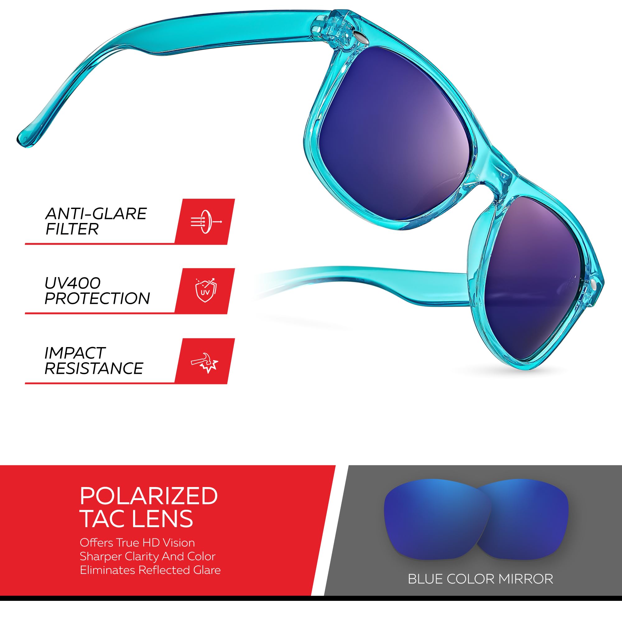 🕶️ 1.1MM TAC POLARIZED LENSES WITH UV400 PROTECTION: Keep your eyes safe from that annoying glare from shiny surfaces (e.g. pavement, snow or water) with our designer sunglasses for women and men, which feature polarized anti-glare lenses with UVA & UVB protection.
