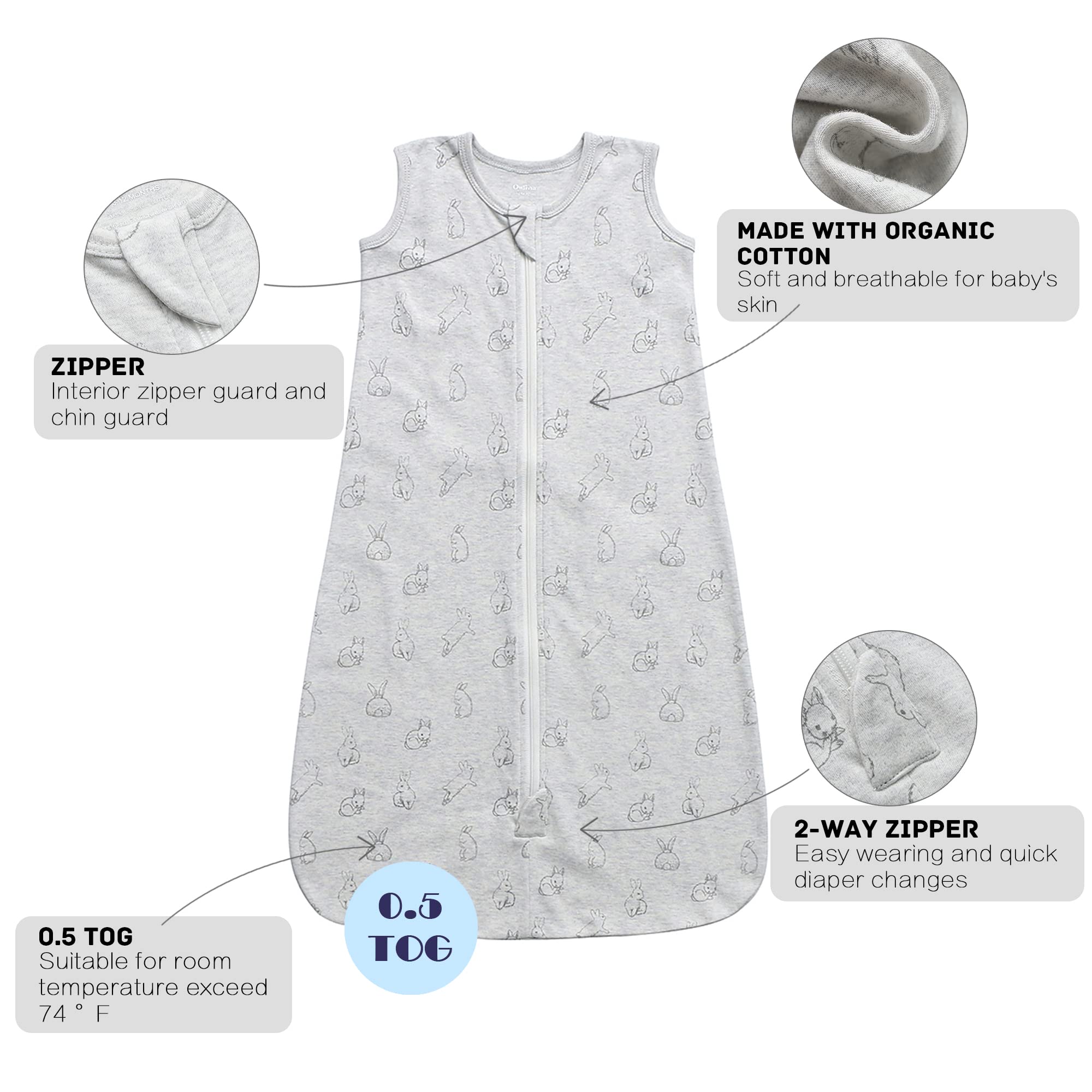 【Light and Comfortable】: With a 0.5 TOG rating, this sleeping bag is ideal for warm weather and suitable for room temperatures exceeding 74 °F. The sleeveless design reduces the risk of overheating, ensuring your baby stays comfortable all night long.