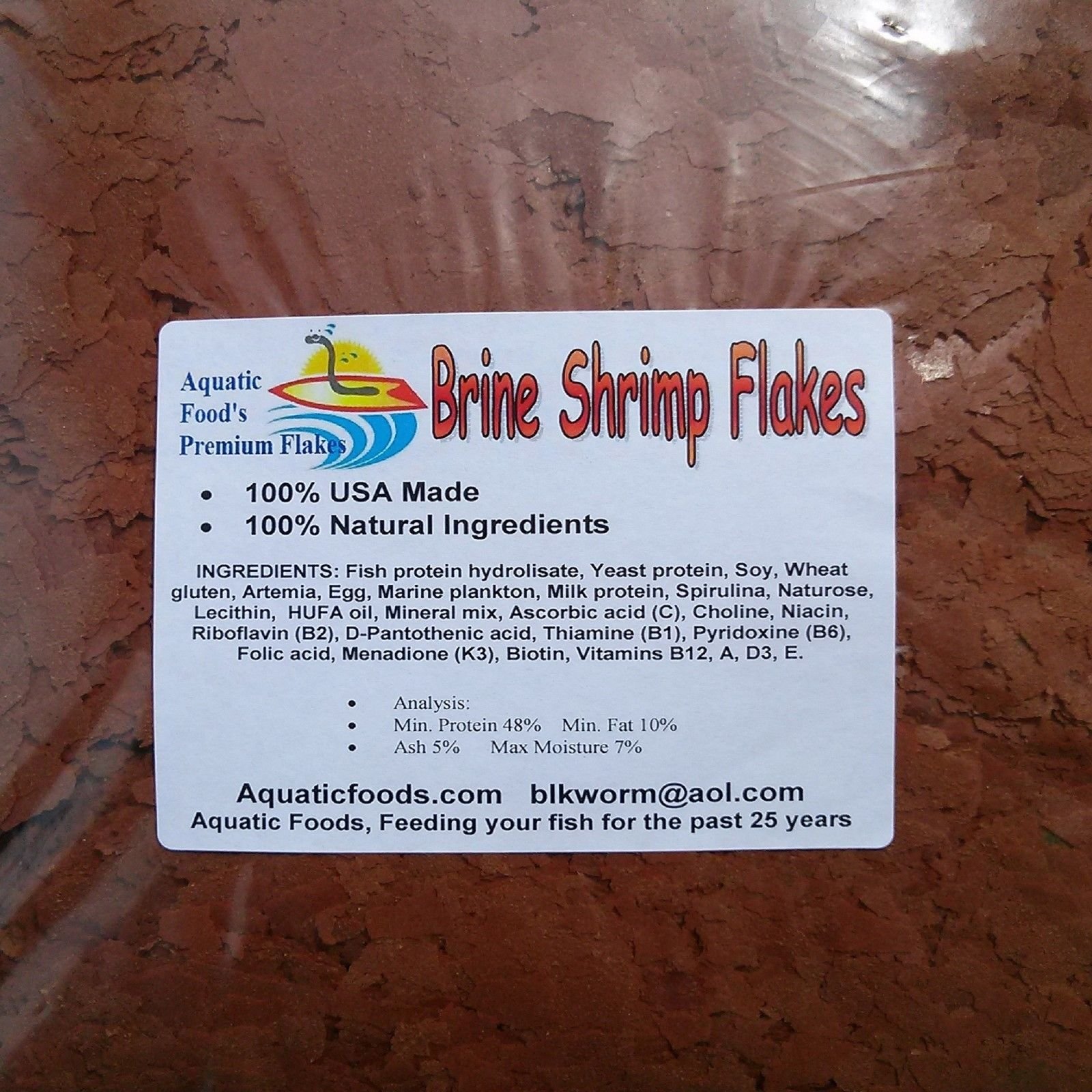 Brine Shrimp Flakes food is a nutritionally balanced formulation with natural Astaxanthin for beautiful color, consistent growth and palatability.Ingredients: Salmon Meal, Yeast protein, Soy, Wheat gluten, Brine Shrimp, Egg, Marine Plankton, Milk protein, Spirulina, Naturose, Lecithin, HUFA oil, Mineral mix, Ascorbic acid (C), Choline, Niacin, Riboflavin (B2), D-Pantothenic acid, Thiamine (B1), Pyridoxine (B6), Folic acid, Menadione (K3), Biotin, Vitamins B12, A, D3, E, Probiotics.Apx Analysis: Protein: 48%, Fat: 10%, Ash: 5%, Moisture: 7%Note: Aquatic Foods Premium Flakes are packed in a easy use Zip Lock Bag and shipped in a Bubble Pack or a Hard Box for safe shipping. Keep in mind Flakes are fragile, there may always be smaller flakes and some powdered within your order.