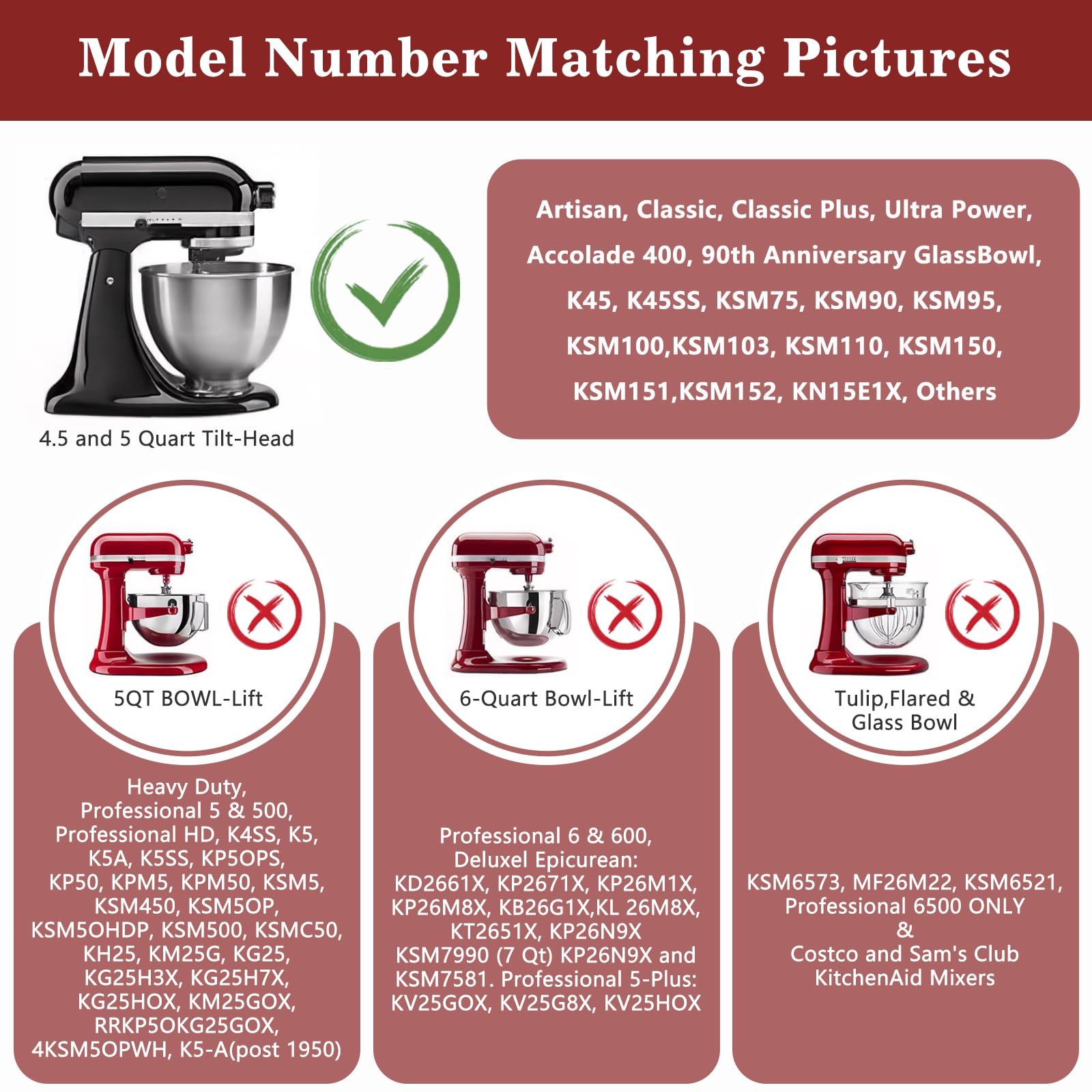 Universal and Compatible: For 4. 5 and 5 quart tilt-head stand mixer bowls. Fits Models - K45SS, KSM1, KSM100, KSM110, KSM120, KSM15, KSM16, KSM75, KSM8, KSM9. Fits Select KA Tilt-Head Stand Mixers. If unsure about your mixer's size, feel free to contact us anytime.