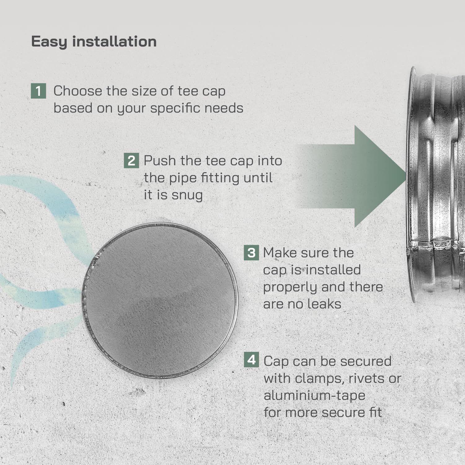 Easy to install - push-fit end plug/cap in the duct. fix with clamp, alu-tape or rivets.