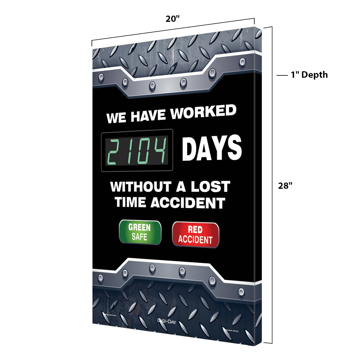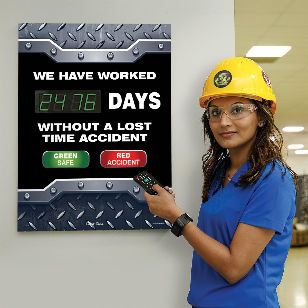 Digi-Day Electronic Digital Scoreboard is our top-notch safety awareness sign that helps management visibly take the lead in promoting a safer workplace. This versatile safety scoreboard has a slim, sleek design with a durable aluminum face and bright LED numeric display. The durable aluminum face is protected by SignMuscle, our scientifically strong protective coating, and sports a bright four-digit LED numeric display. Includes built-in, hidden rear mounting brackets for easy installation. Digi-Day is programmable to your specifications – it can track safe days using a standard seven-day week, or your company’s specific scheduled workdays. Includes a hand-held remote that can control up to five separate displays – and the displays can be set to count safe days only, or flash from days to time to date. Operates on 110/120 VAC with 8-ft. power cord and AC adapter, designed for indoor use. During a power failure, Digi-Day automatically stores all information and indicates when a power outage has occurred. Simple step-by-step instructions are available to help you set up and operate your Digi-Day. For 40+ years, Accuform NMC has worked to perfect our safety signs, safety tags and safety label manufacturing processes. With our full product line safely made in the USA, AccuformNMC paves the way to a better future in facility safety identification – one innovative product at a time.