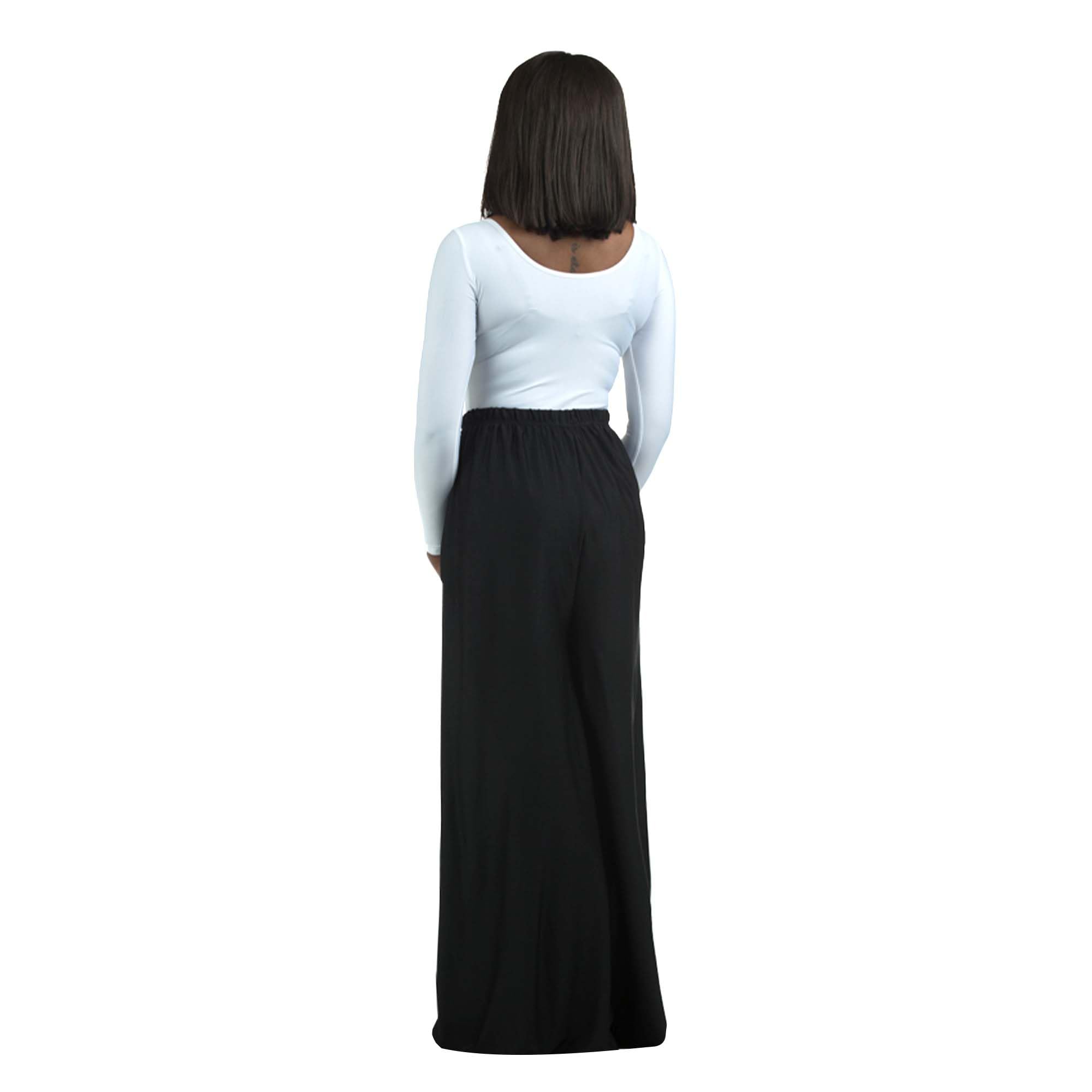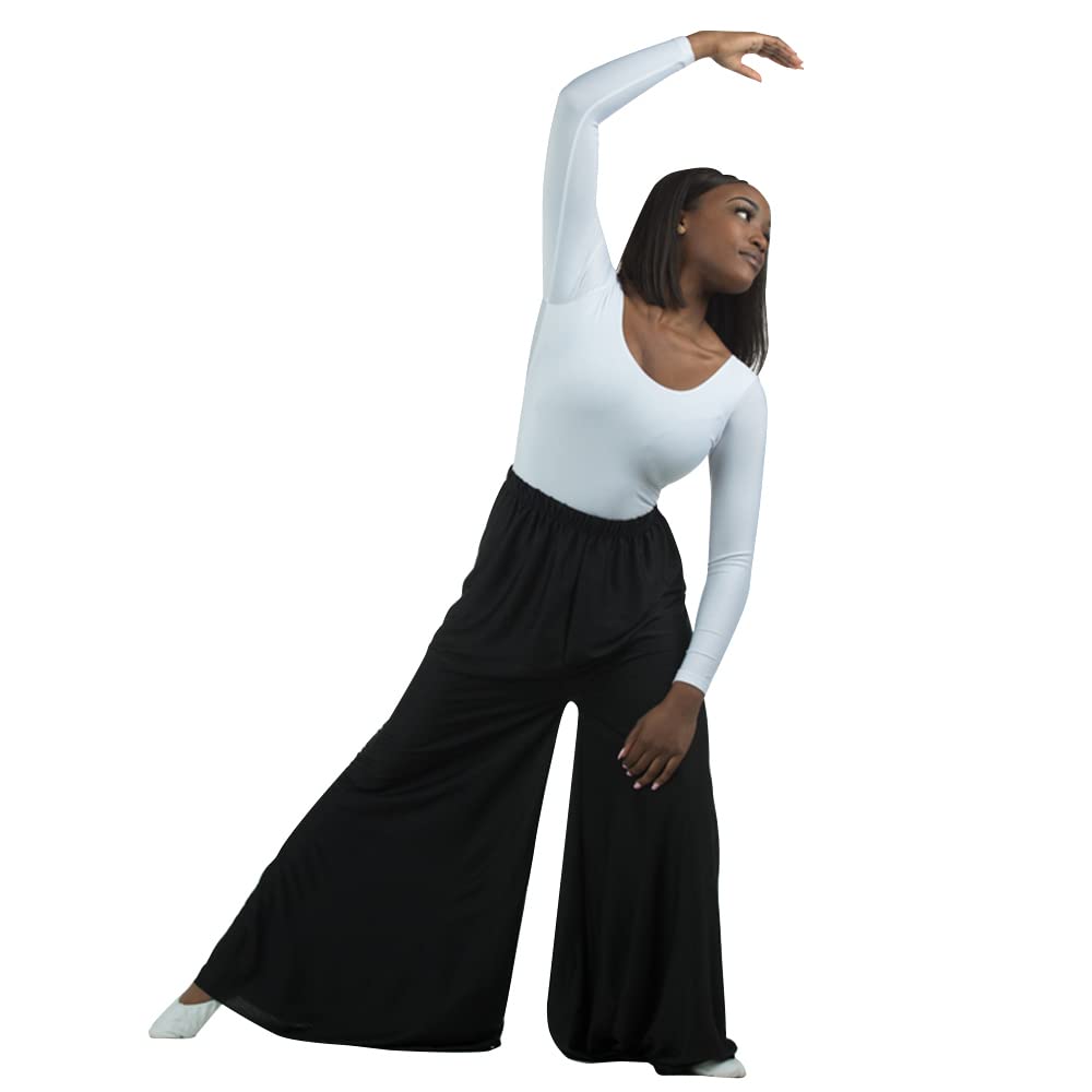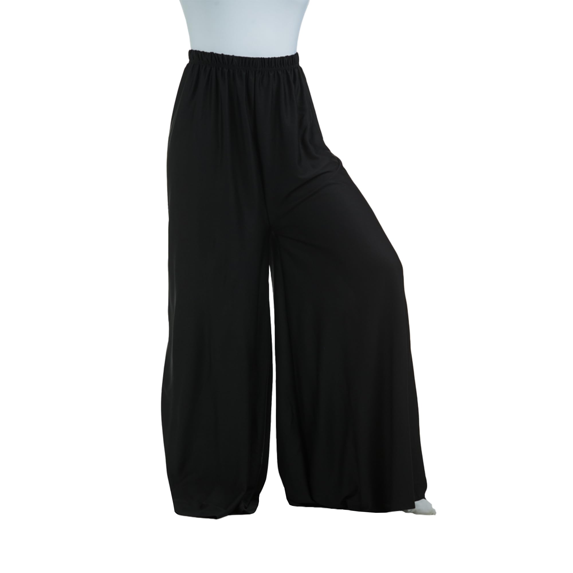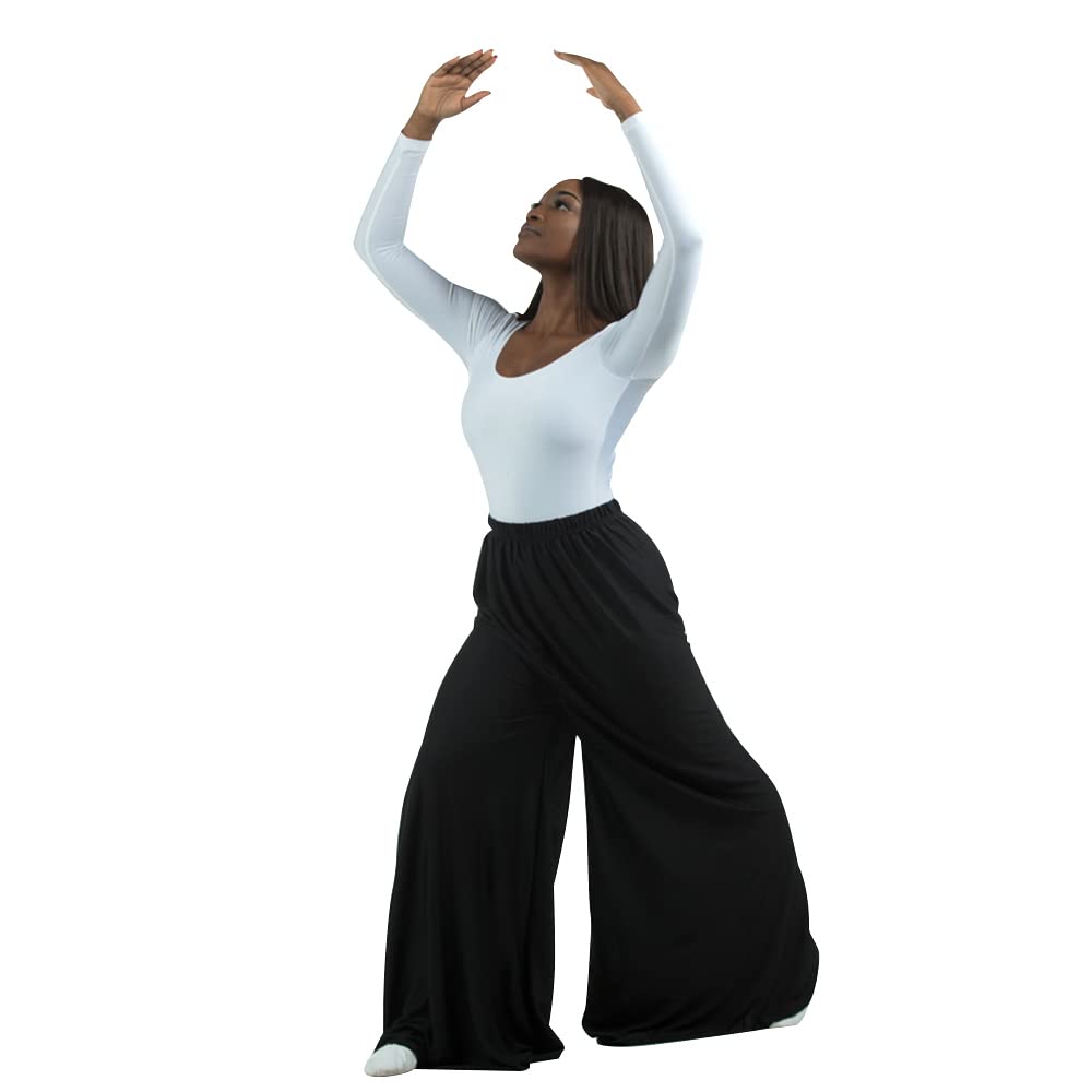 Description Palazzo pant is designed for dancers that perform spiritual or liturgical dancing. This pant features a loose and extra wide leg fit. The polyester/spandex fabric is smooth, soft, and moves easily when dancing. The elastic waistband design provides a comfortable fit and easy changing for performances. The palazzo pants are made in full length in order to fit the majority. But no need to worry about them being too long. You can easily cut to your size in length without a need for a hem as the material does not unravel or fray.