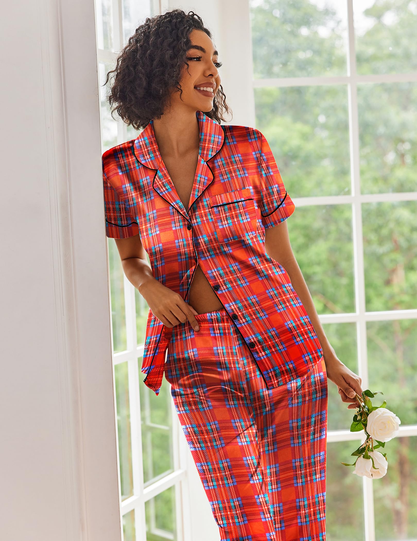 Soft Satin Pajama Set: Made of premium 95% Polyester, 5% Spandex silk satin, the pajama set for women is lightweight, breathable and skin-friendly, just like wrapped in a cloud, helping you have a sound sleep