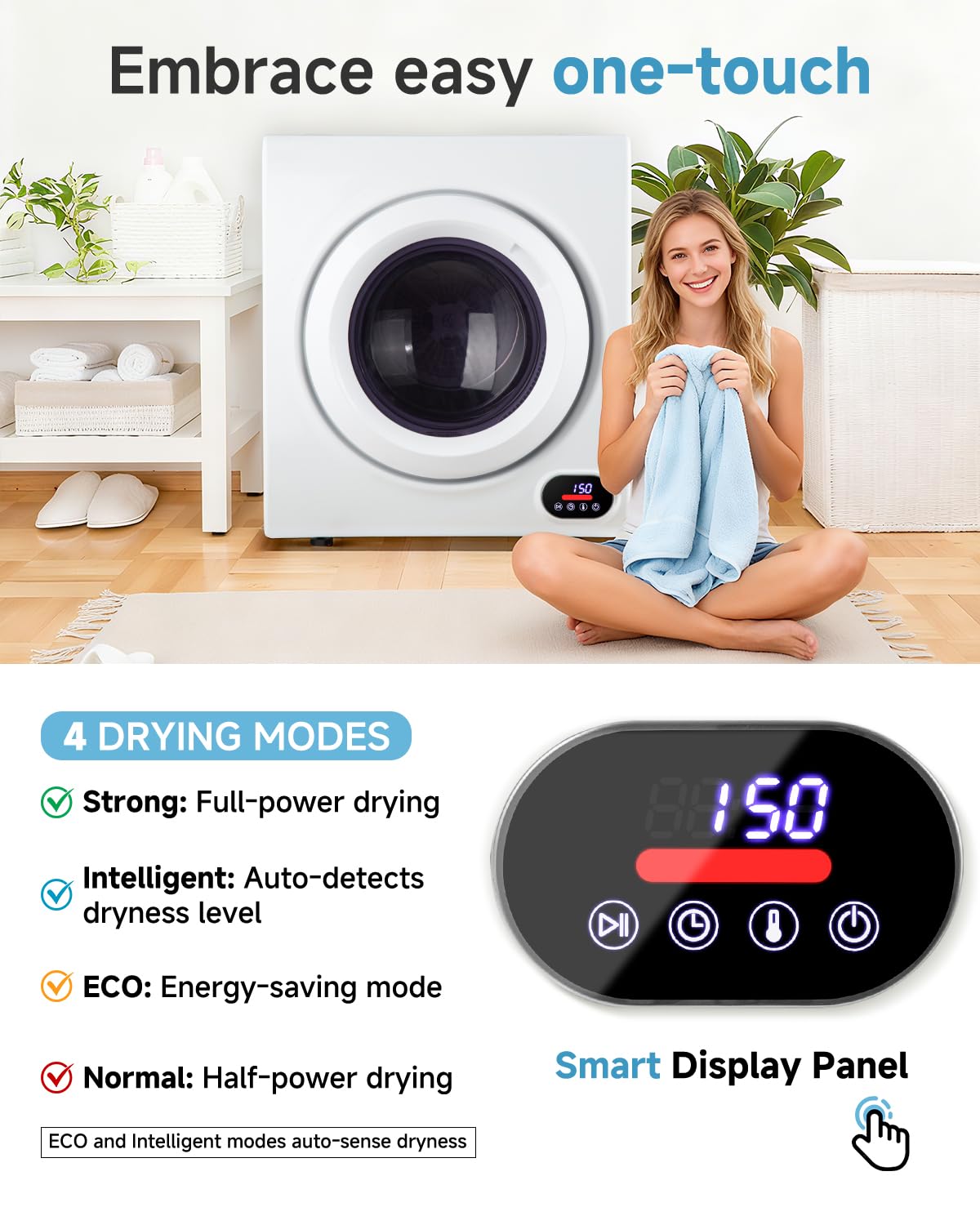 【Easy to Operate】Designed with user-friendly LED touch control, this electric dryer is simple to operate. It offers four drying modes to suit different fabrics and load weights, and once you set it, you can go about your day while it works. The mini dryer runs quietly, so you won’t be disturbed during conversations or while sleeping.