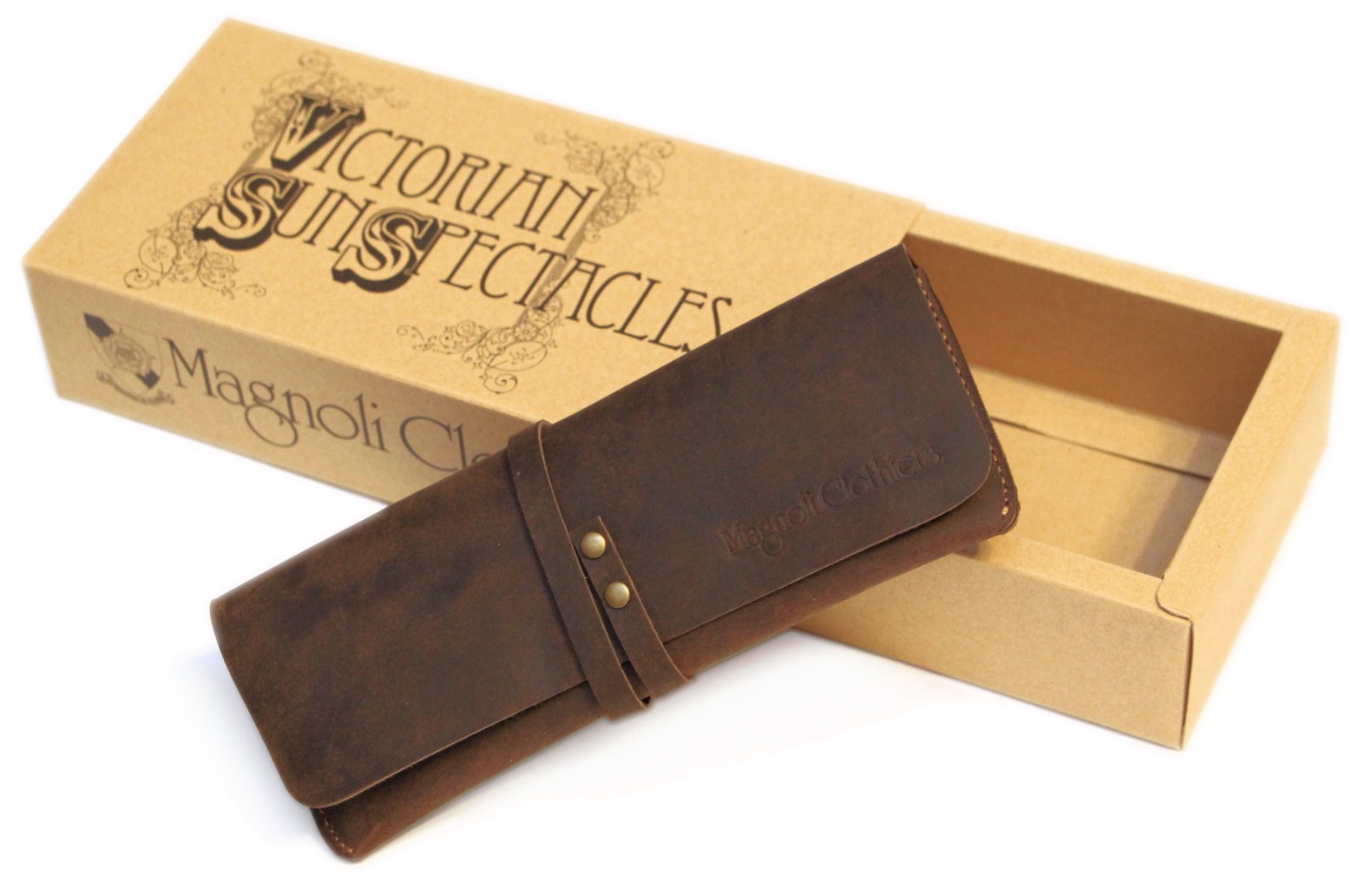 Description These sunglasses are based on genuine Victorian-period pieces making them perfect for historic reenactors as well as Steampunk costumes or regular, daily use. The side shields are hinged so they can double the front lens or swing out to fit a range of face widths. The curled cable temples will keep these glasses securely in place. Available in Seven color combinations: Matte Gold with Green Lenses, Matte Gold with Amber Brown Lenses, Matte Silver with Blue Lenses or Matte Silver with Red Lenses, all historically accurate. Additional: Gold frame with Dark Grey Lenses, Silver frame with Grey Lenses, Black frame with Grey Lenses. Includes genuine leather carrying wallet.