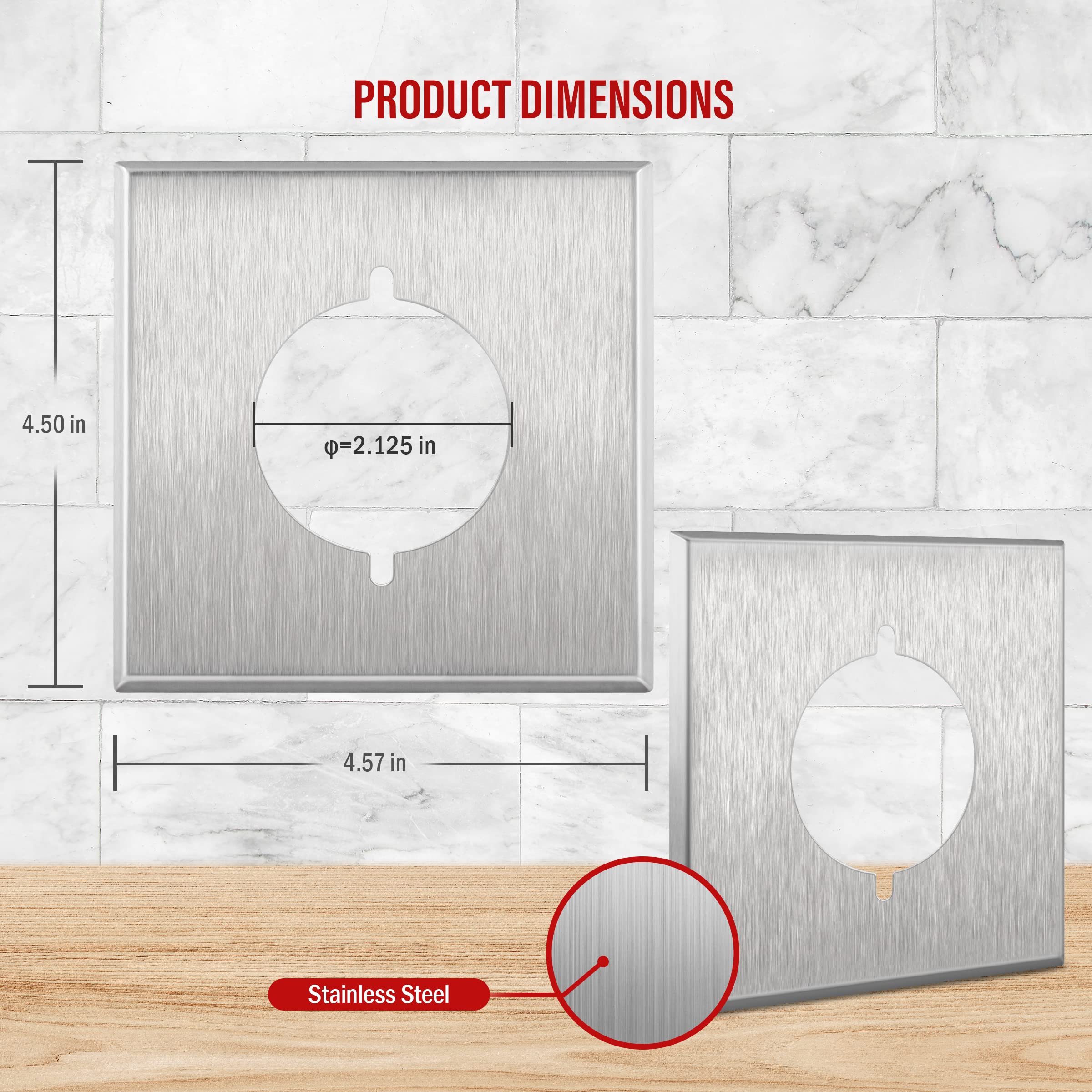This stainless-steel wall plate measures 4.57” Length x 4.50” Height x .25” Width. The diameter of the hole is 2.125 inches.